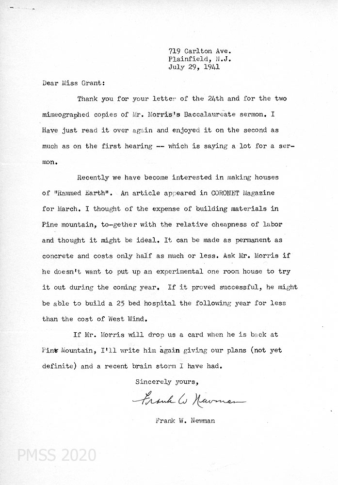 [040] July 29, 1941. To Miss Grant from Frank W. Newman, who thanks her for the copies of the sermon. Suggests that she tell Morris about “Rammed Earth” houses.