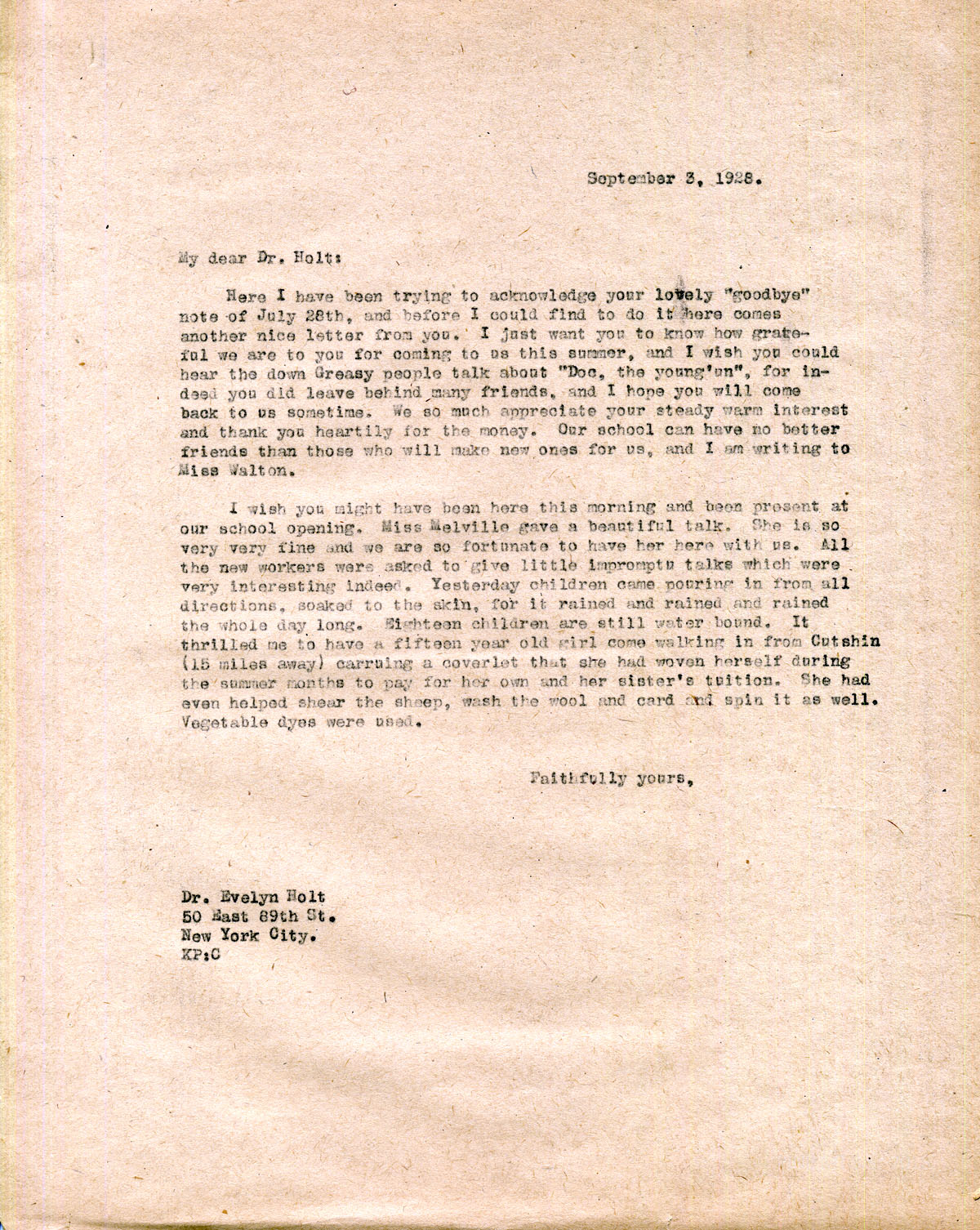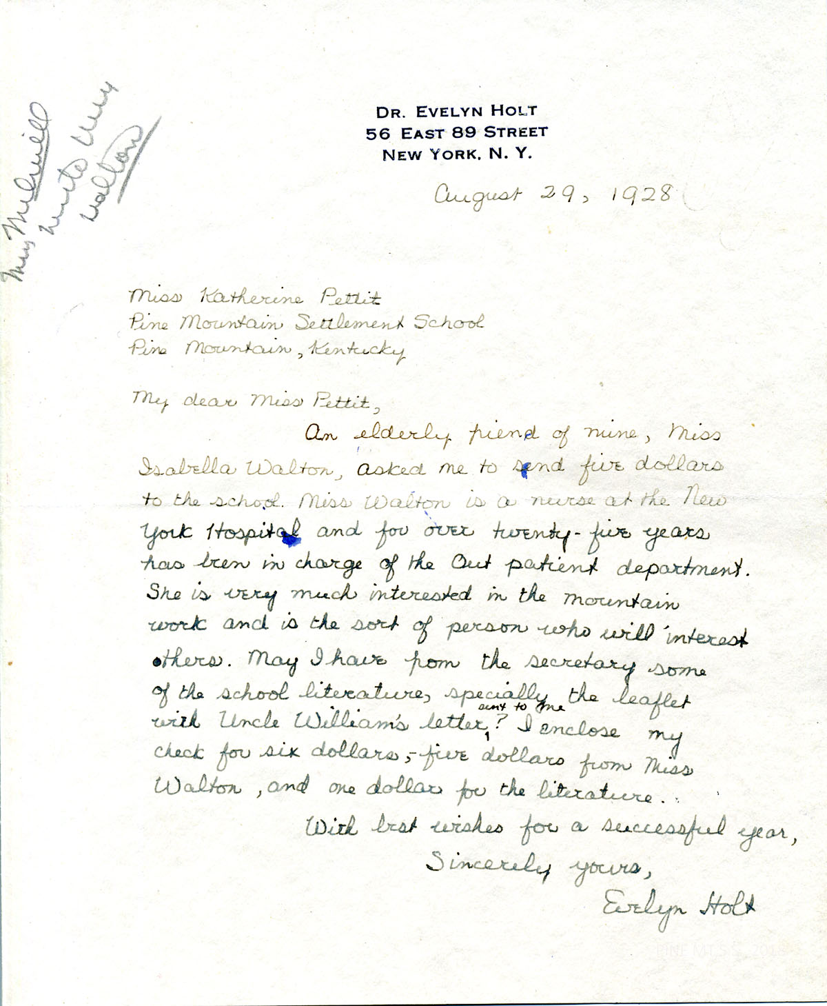 TAGS: Dr. Evelyn Holt correspondence, Dr. Evelyn Holt, Pine Mountain Settlement School, Evelyn K. Wells, Dr. Alfreda Withington, women physicians, nurses, Miss Marian Purbrick, Big Laurel Medical Settlement, Harmon Turner, lumber camps