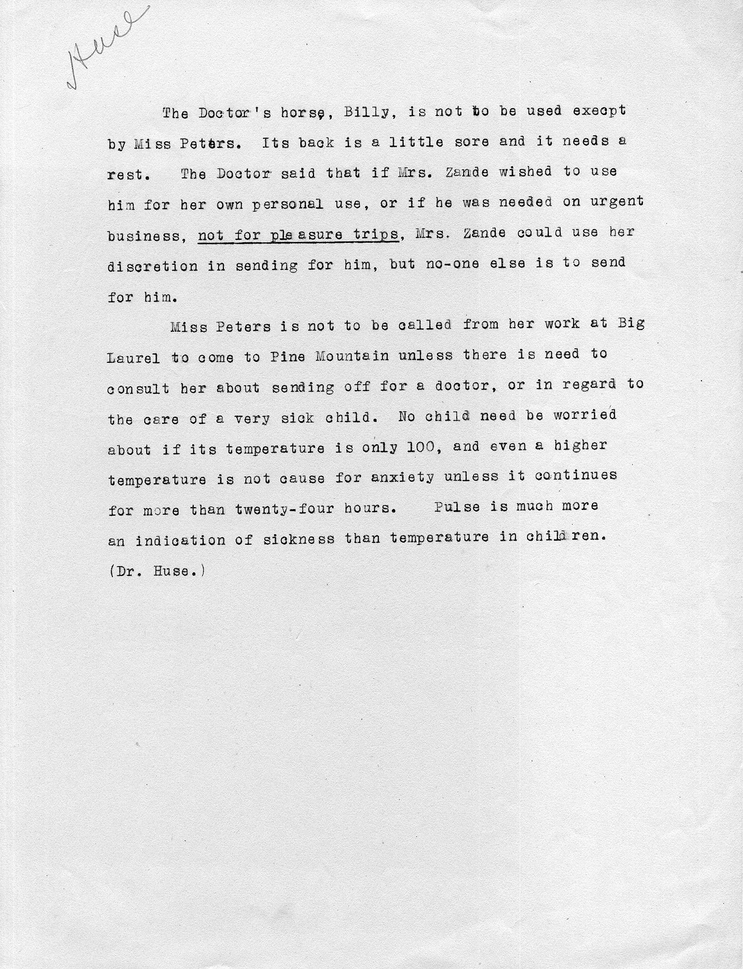 N.D. Memorandum from Dr. Huse, stating rules for using the Doctor’s horse, Billy, and for calling for Miss Peters at Big Laurel to come to Pine Mountain. Also, advice on how to determine the severity of a child’s sickness. “Pulse is much more an indication of sickness than temperature in children.”