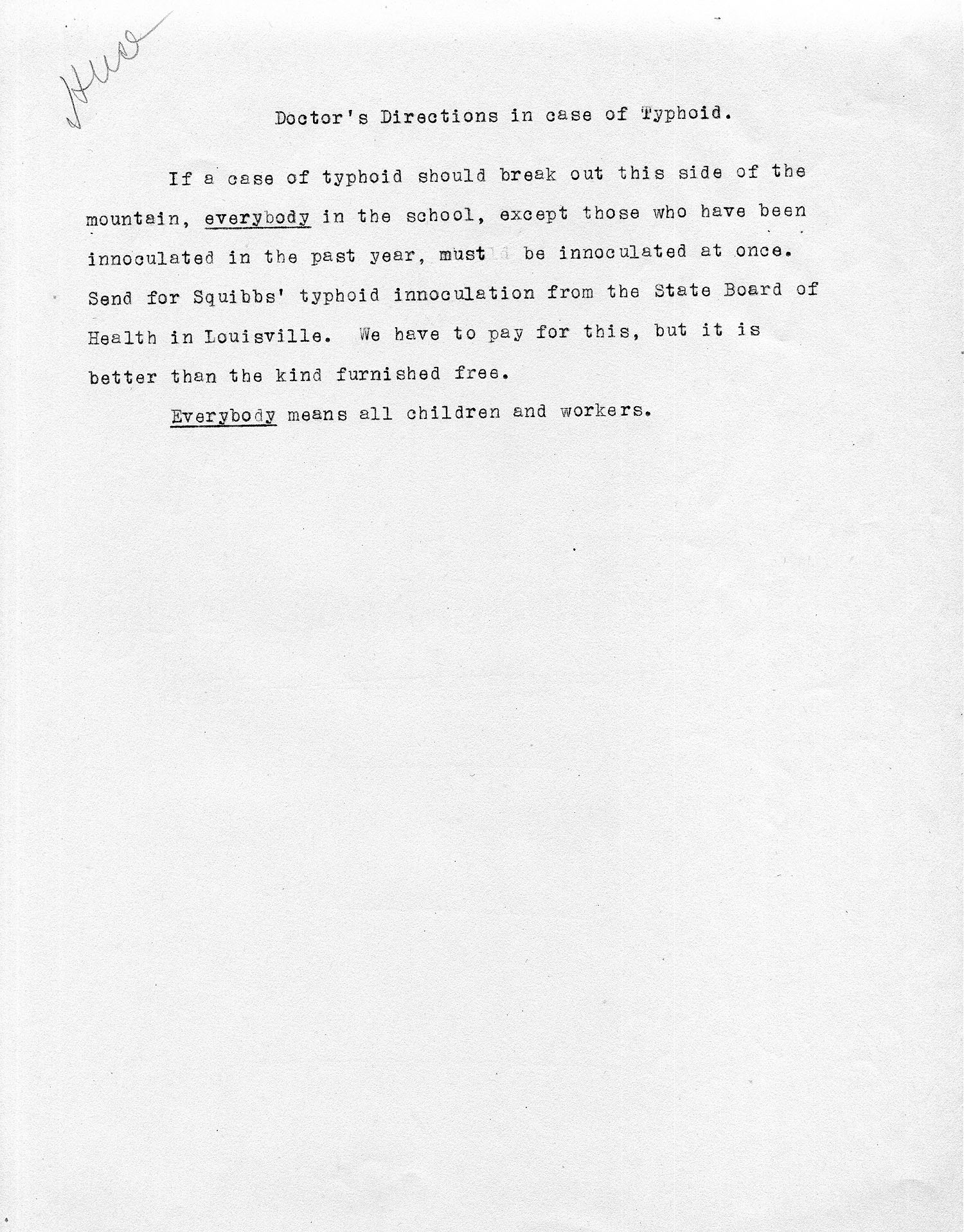 N.D. Unsigned memorandum, providing “Doctor’s Directions in case of typhoid. If a case of thyroid should break out this side of the mountain, everyone in the school, except those who have been inoculated in the past year, must be inoculated at once. Send for Squibbs’ typhoid inoculation from the State Board of Health in Louisville. …”