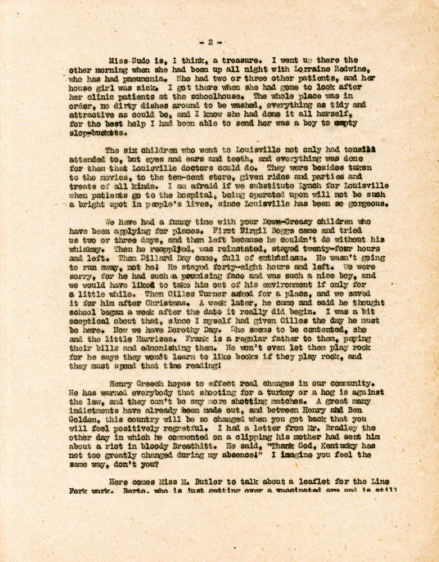 [009, page 2] Praises the work of Miss [Maya] Sudo, “a treasure,” who “had been up all night with Lorraine Redwine who has pneumonia….” Six children went to Louisville to have their tonsils removed and eyes, ears, and teeth checked and were given parties, and other treats. Tells about “your Down-Greasy children” who applied for PMSS: Two failed to stay: Virgil Boggs, Dillard Day. Cilles Turner arrived late, but Dorothy Day “seems to be contented, she and the little Harrises. Frank is a regular father to them….” Tells about Henry Creech and Ben Golden banning shooting matches. Mentions Miss M. (Marguerite) Butler and Berto (Zande).