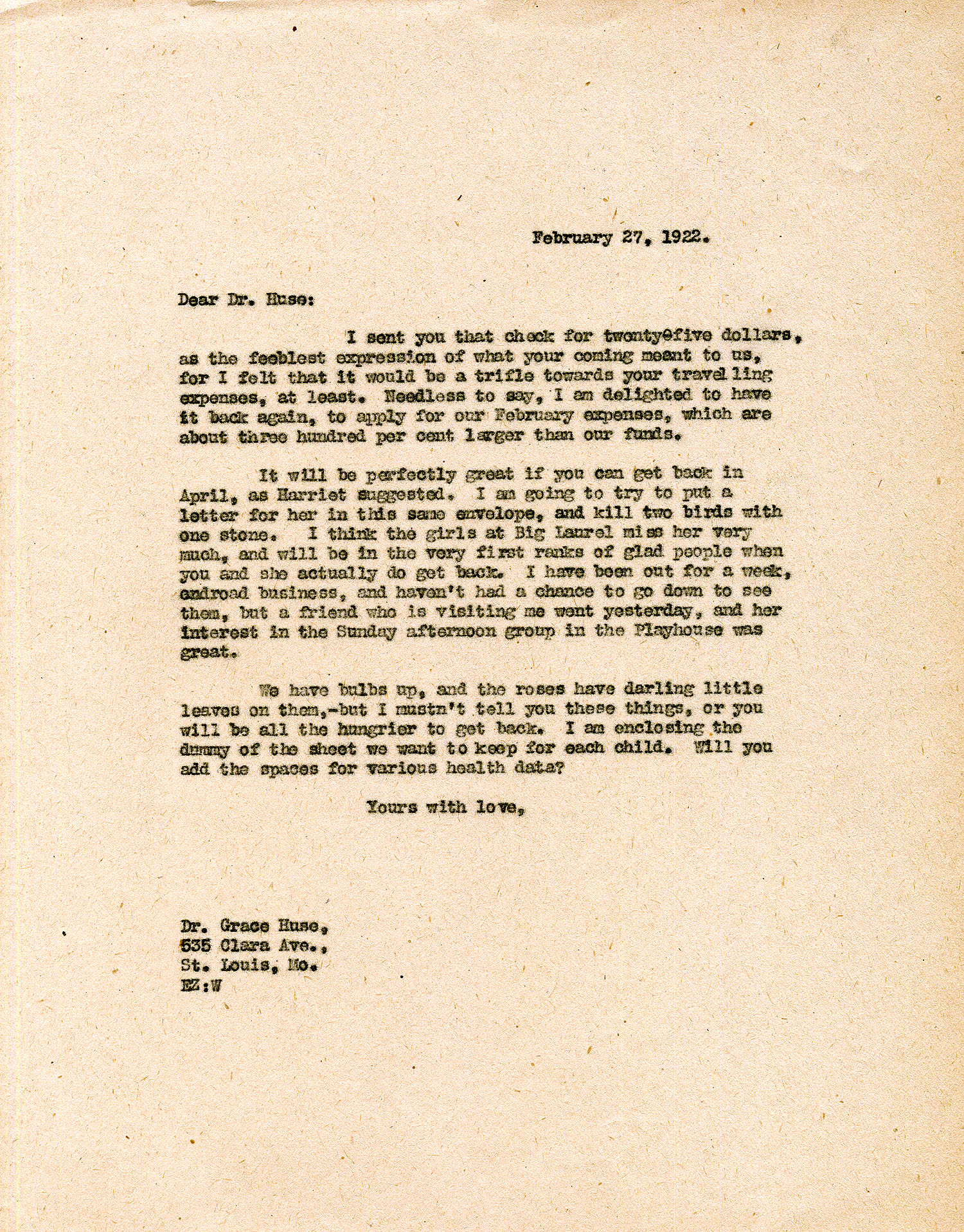 February 27, 1922. EZ (Zande) to Dr. Huse in St. Louis, MO. Dr. Huse returned a $25 check for travel expense to Zande, who writes that she will “apply for our February expenses, which are about three hundred per cent larger than our funds.” Zande hopes Dr. Huse and Butler will return in April. Encloses a draft of a sheet that is kept for each child and asks Huse to added spaces for health data.