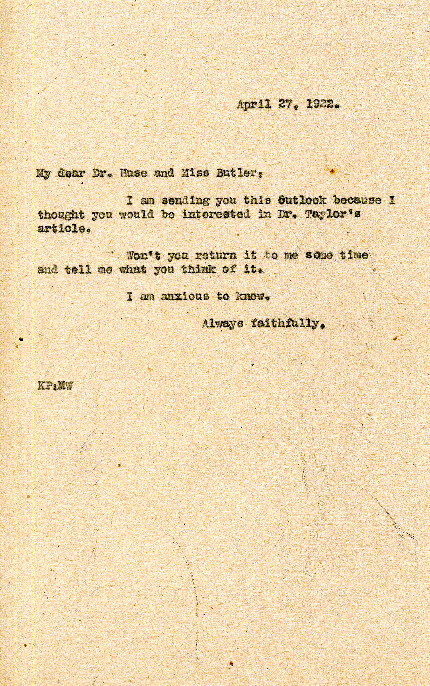 April 27, 1922. KP (Katherine Pettit) to Dr. Huse and Miss Butler in St. Louis, MO, sending an article from Outlook by Dr. Taylor.