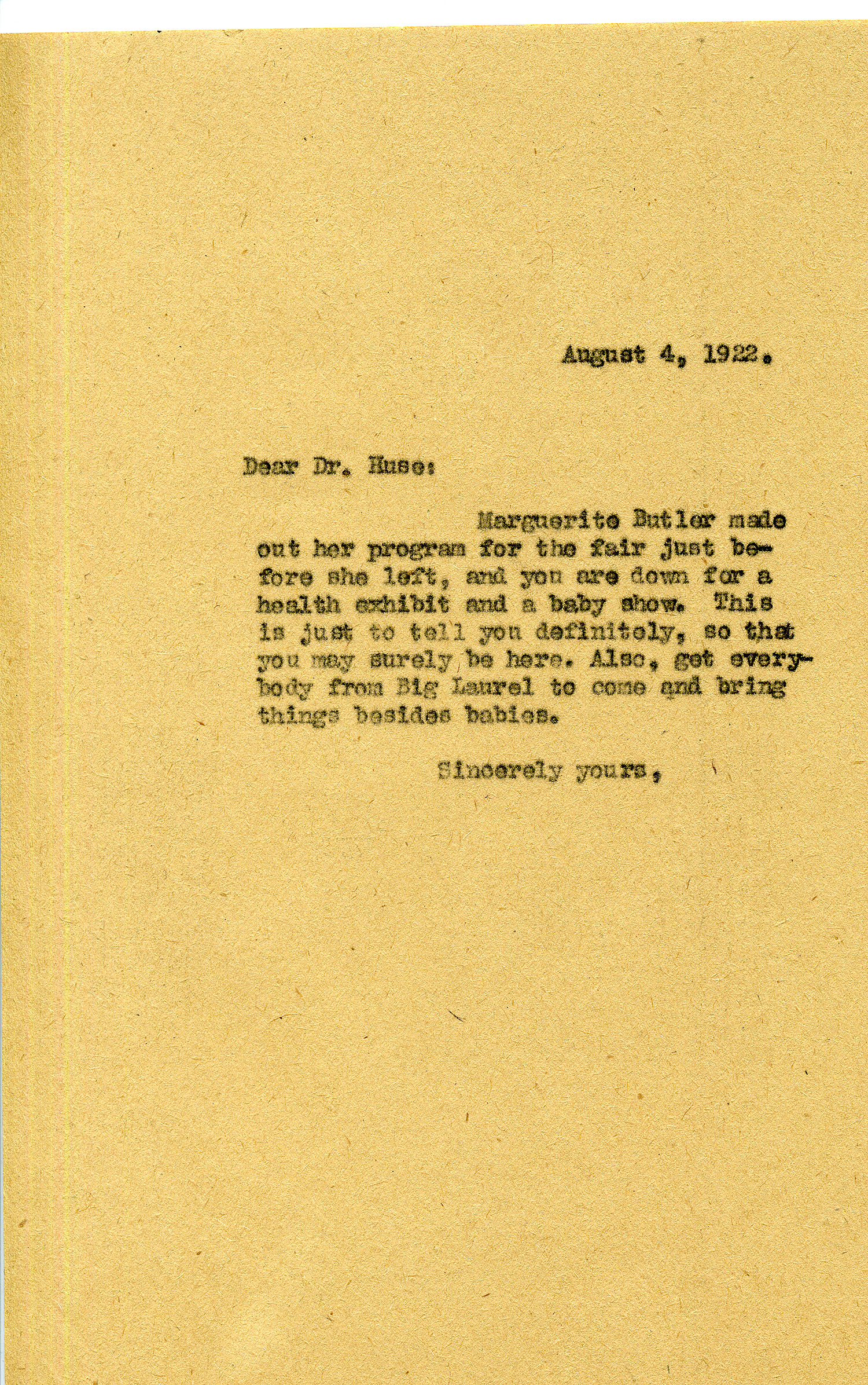 August 4, 1922. (Unsigned) to Dr. Huse at Big Laurel, Ky, informing her that Marguerite Butler’s Fair program includes a health exhibit and a baby show by Huse.