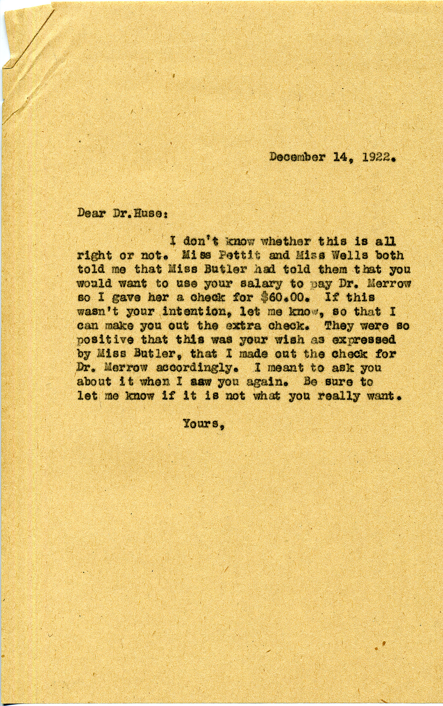 December 14, 1922. (Unsigned) to Dr. Huse. Asks for Huse’s confirmation that Huse’s salary ($60) should be used to pay Dr. [Llewella?] Merrow.