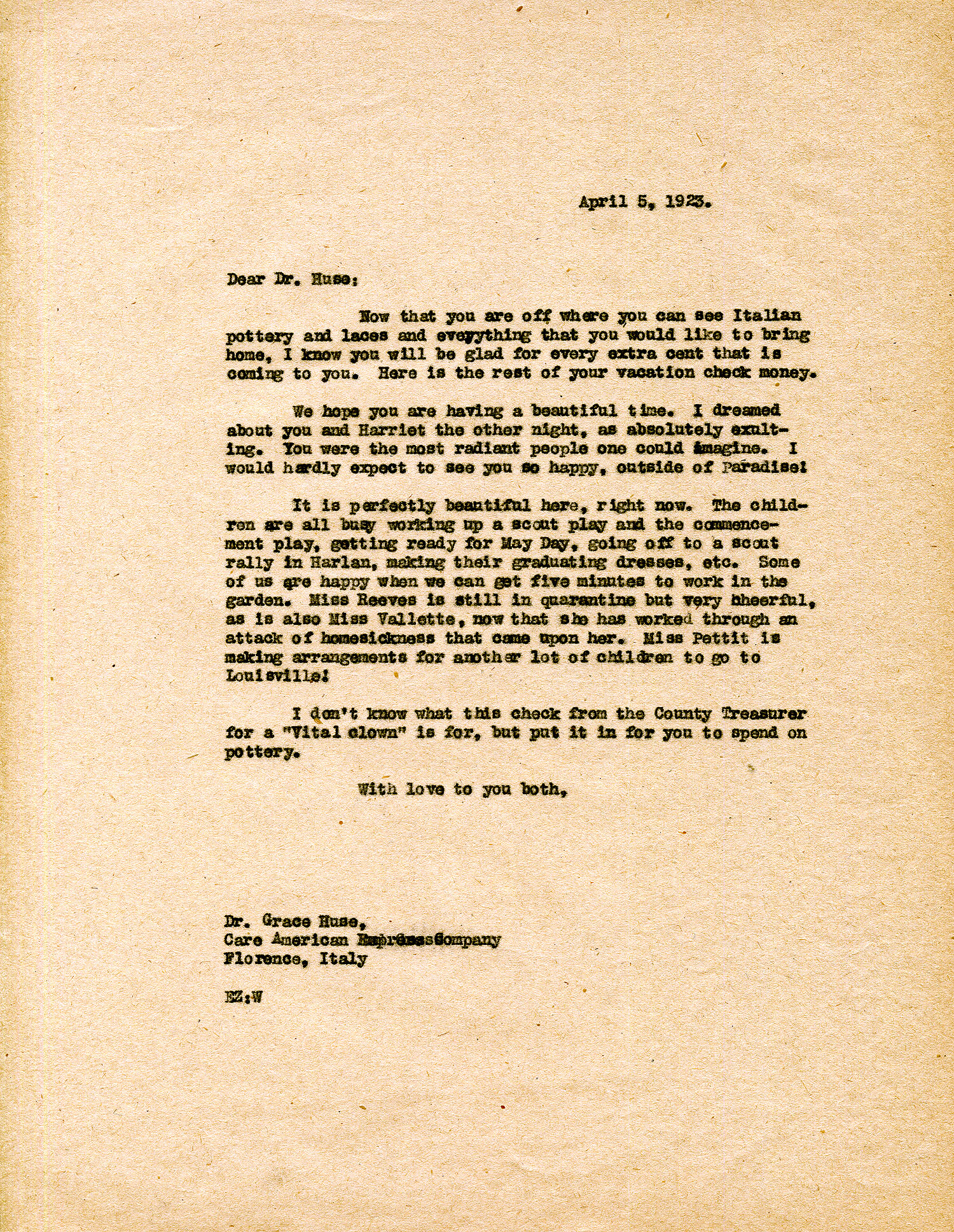 April 5, 1923. EZ (Zande) to Dr. Huse, ℅ American Express Company, Florence, Italy, sending Huse the rest of her vacation check money. Lists the children’s activities; Miss (Florence) Reeves and Miss Vallette are in quarantine.