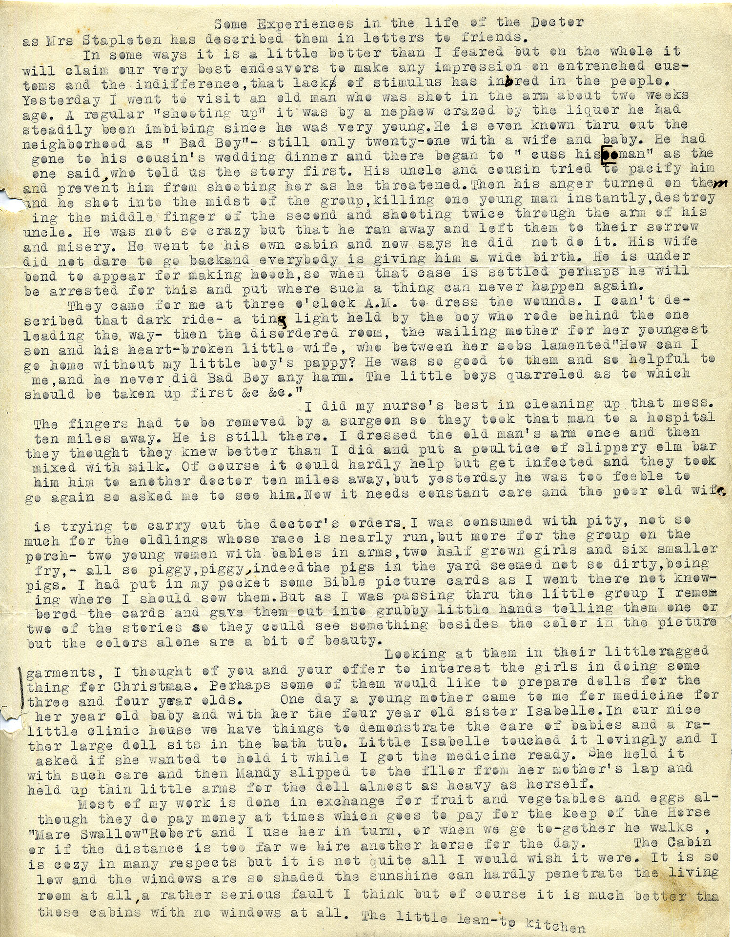Pine Mountain Settlement School served as the administrative center for both the Line Fork Settlement and the Medical Settlement at Big Laurel. Dr. Ida Stapleton was both the physician assigned to Line Fork, as well as its administrator. She was required to complete a series of reports for Katherine Pettit and for the board of trustees of Pine Mountain School on the work at Line Fork. These reports are filled with information of the couple’s endeavors to address the many issues they encountered with their work, but they also contain anecdotal personal reflections on their interactions with the diverse community of Line Fork.