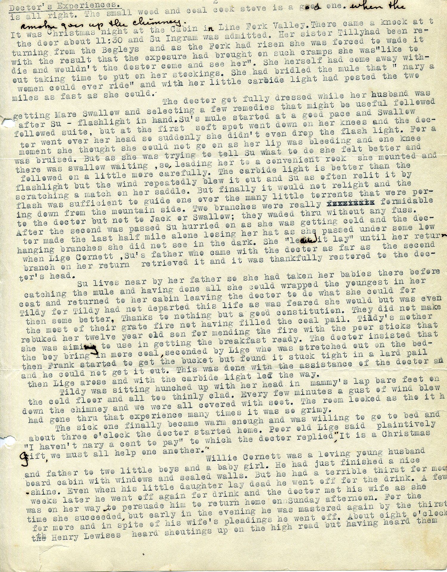 The doctor got fully dressed while her husband was getting Mare Swallow and selecting a few remedies that might be useful, followed after Su – flashlight in hand. Su’s mule started at a good pace and Swallow followed suit, but at the first soft spot went down on her knees and the doctor went over her head so suddenly she didn’t even drop the flashlight. For a moment she thought she could not go on as her lip was bleeding and one knee was bruised. But as she was trying to tell Su what to do she felt better and there was Swallow waiting, so leading her to a convenient rock she mounted and followed on a little more carefully. The carbide light is better than the flashlight but the wind repeatedly blew it out and Su as often relit it by scratching a match on her saddle. But finally it would not relight and the flash was sufficient to guide one over the many little torrents that were pouring down the mountainside. The branches were really formidable to the doctor but not to Jack or Swallow; they wade thru without any fuss. After the second was passed Su hurried on as she was getting cold and the doctor made the last half mile alone losing her hat as she passed under some low hanging branches she did not see in the dark. She “left it lay” until her return when Lige Cornett, Su’s father who came with the doctor as far as the second branch on her return, retrieved it and it was thankfully restored to the doctor’s head.