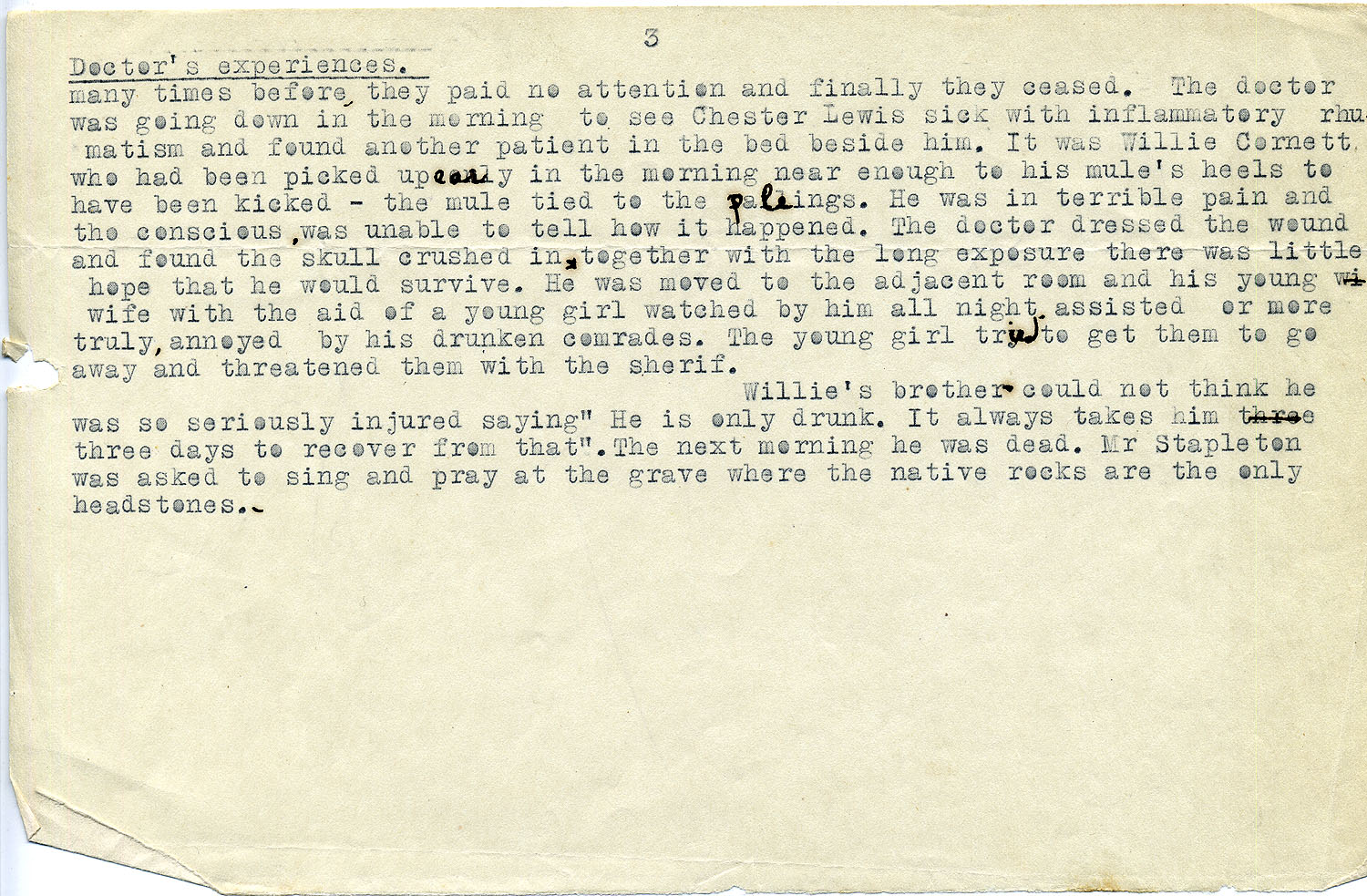 Willie Cornett was a loving young husband and father to two little boys and a baby girl. He had just finished a nice board cabin with windows and sealed walls. But he had a terrible thirst for moonshine. Even when his little daughter lay dead he went off for the drink. A few weeks later he went off again for drink and the doctor met his wife as she was on her way to persuade him to return home on Sunday afternoon. For the time she succeeded, but early in the evening he was mastered again by the thirst for more and in spite of his wife’s pleadings he went off. About eight o’clock the Henry Lewises heard shoutings up on the high road but having heard them many times before, they paid no attention and finally they ceased. The doctor was going down in the morning to see Chester Lewis sick with inflammatory rheumatism and found another patient on the bed beside him. It was Willie Cornett who had been picked up early in the morning near enough to his mule’s heels to have been kicked – the mule tied to the palings. He was in terrible pain and tho conscious, was unable to tell how it happened. The doctor dressed the wound and found the skull crushed in; together with the long exposure there was little hope that he would survive. He was moved to the adjacent room and his young wife with the aid of a young girl watched by him all night, assisted or more truly, annoyed by his drunken comrades. The young girl tried to get them to go away and threatened them with the sheriff.