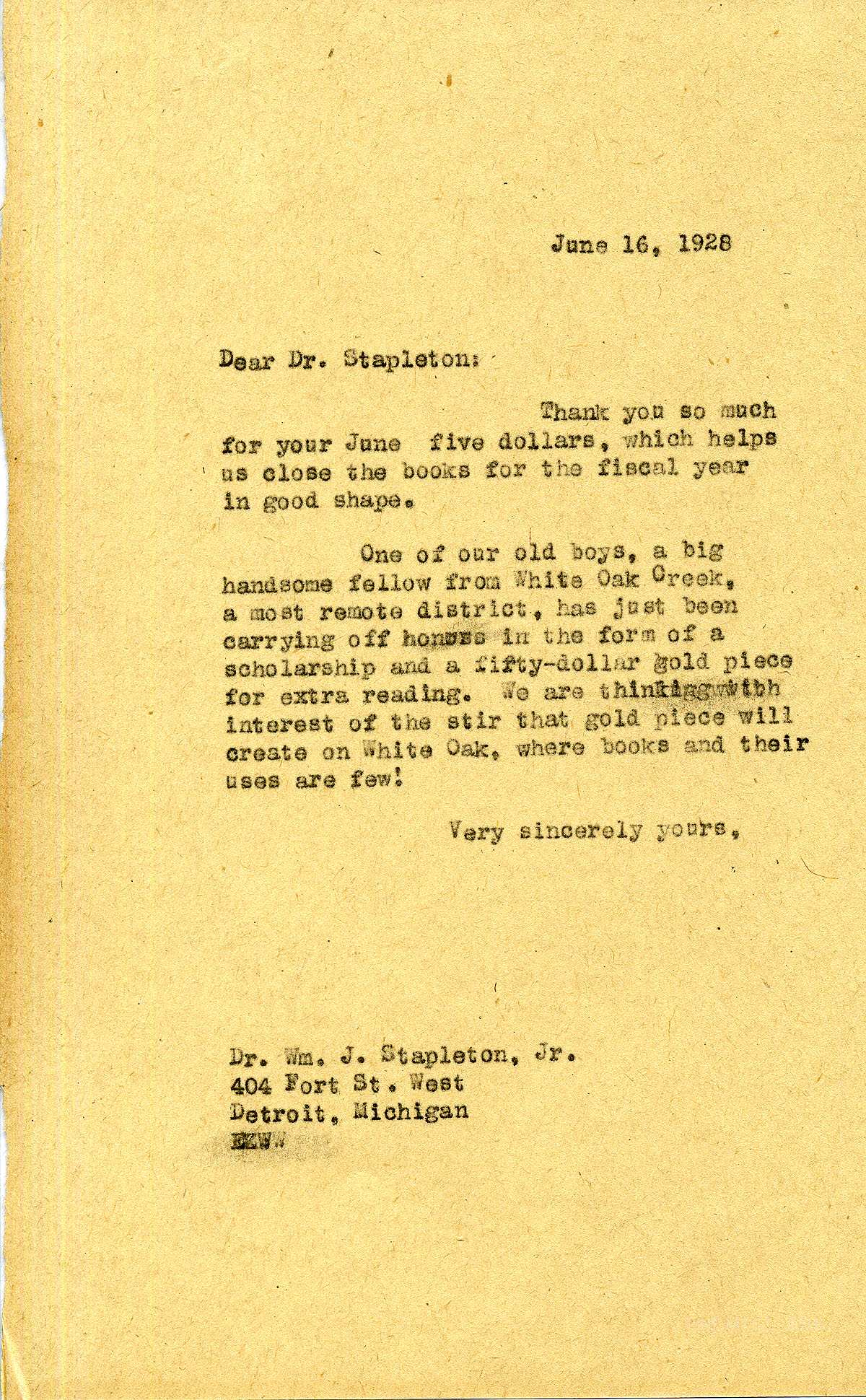 [stapleton_ida_r_1925_067.jpg] June 16, 1928. To Dr. William Stapleton Jr. in Detroit, MI, from EZ. (Ethel de Long Zande). Thanks him for his $5 annual subscription. Tells of the success of “one of our old boys…from White Oak Creek, a most remote district….”