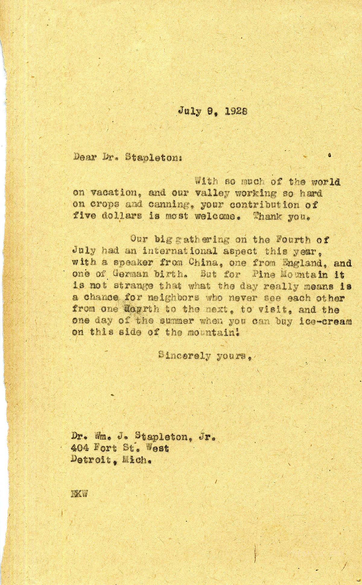 [stapleton_ida_r_1925_069.jpg] July 9, 1928. To Dr. William J. Stapleton Jr. from EKW (Evelyn K. Wells). Welcomes his contribution of $5. Describes PMSS’s Fourth of July, writing “…[F]or Pine Mountain it is…a chance for neighbors, who never see each other from one day to the next, to visit, and the one day of the summer when you can buy ice-cream on this side of the mountain!”