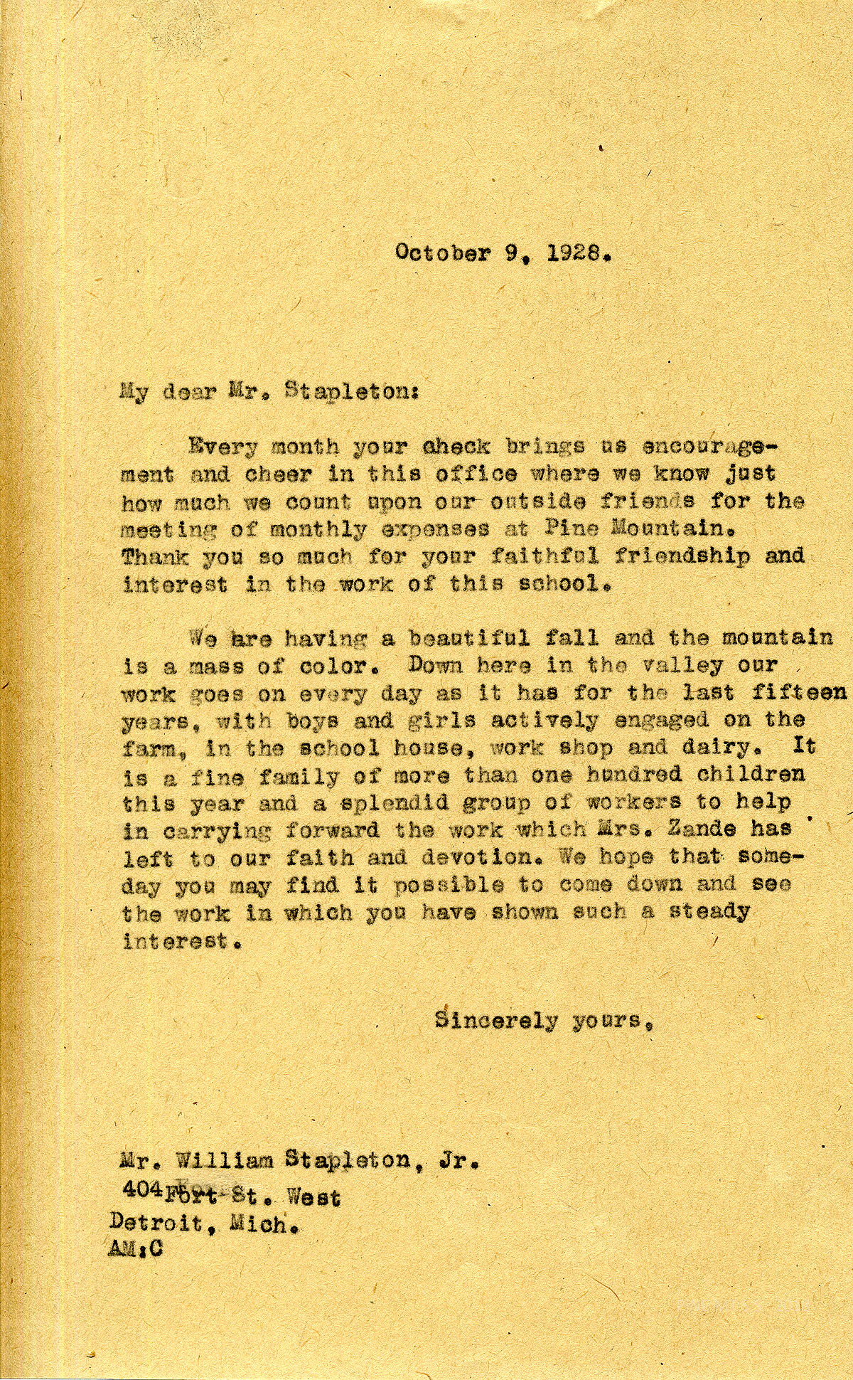 [stapleton_ida_r_1925_070.jpg] October 9, 1928. To Mr. William Stapleton Jr. from AM. “Every month your check brings us encouragement and cheer….” Describes the fall colors and over 100 busy PMSS students. Hopes he will visit someday.
