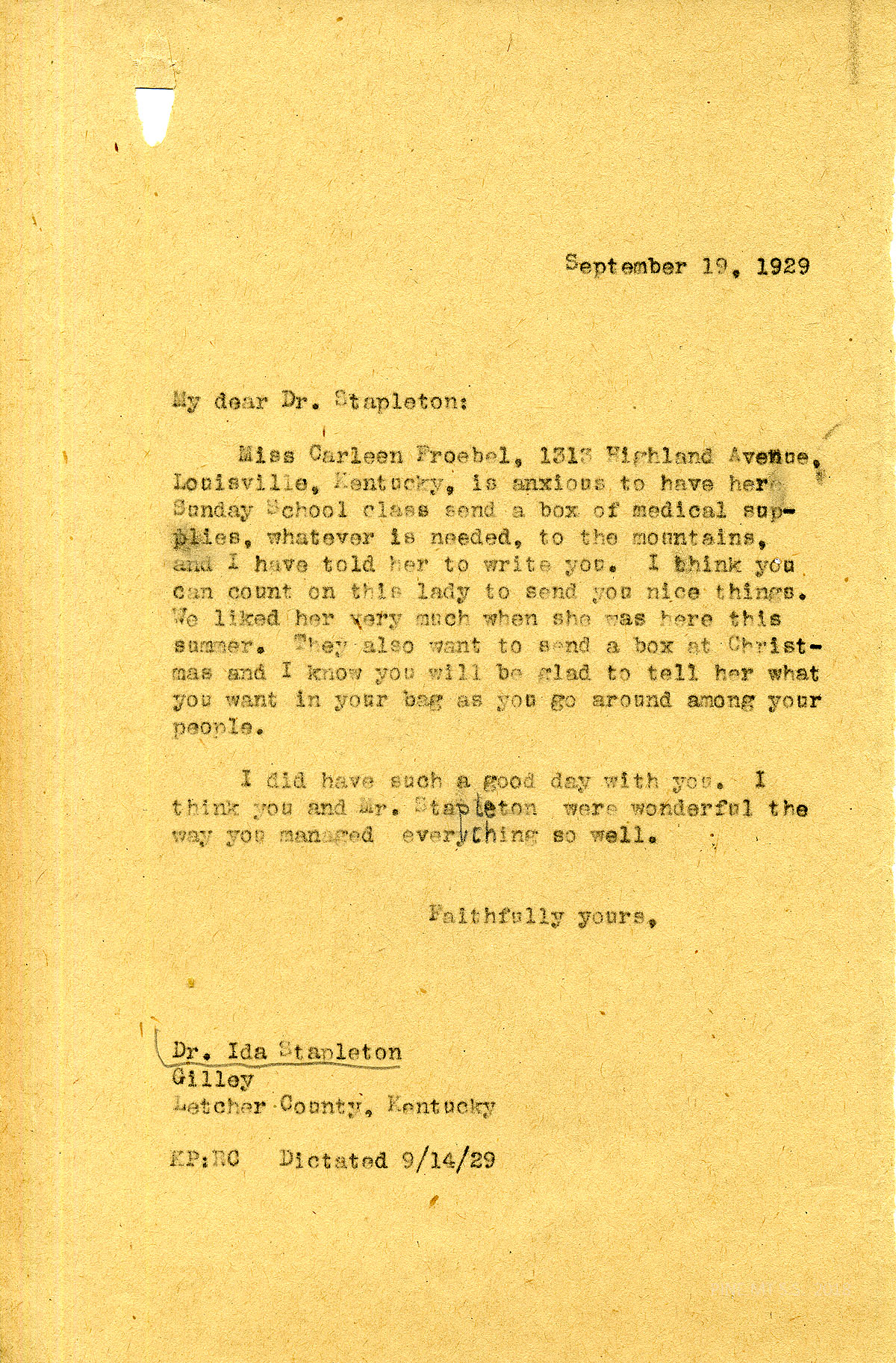 [stapleton_ida_r_1925_075.jpg] September 19, 1929. To Dr. Stapleton from KP. Miss Carleen Froebel of Louisville, KY, and her Sunday School class want to donate a box of medical supplies and a box at Christmas. Asks Stapleton to tell Froebel “what you want in your bag as you go around among your people”