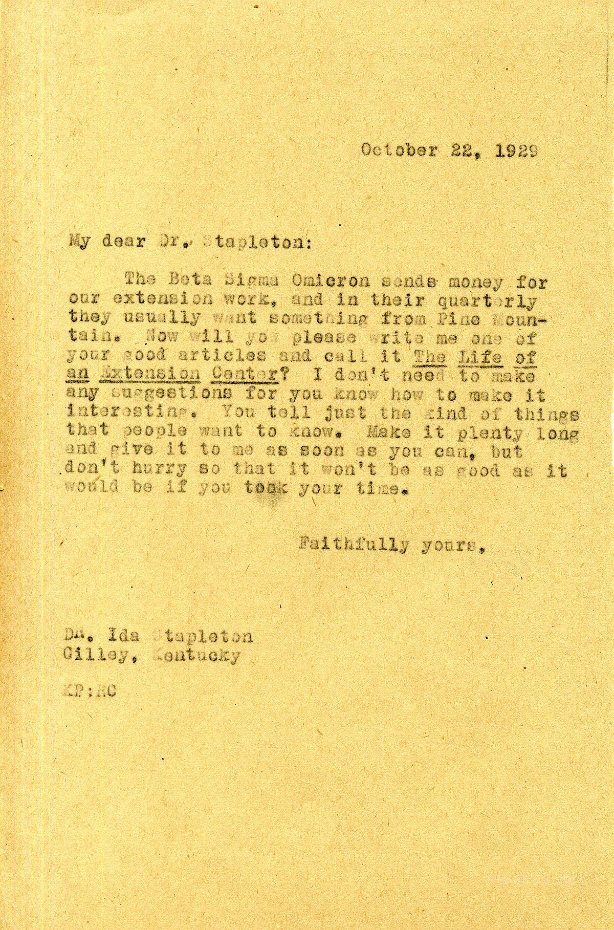 [stapleton_ida_r_1925_078.jpg] October 22, 1929. To Dr. Stapleton from KP. Asks Stapleton to write an article for the Beta Sigma Omicron’s quarterly title “The Life of an Extension Center” in return for the money they donated for the extension center.