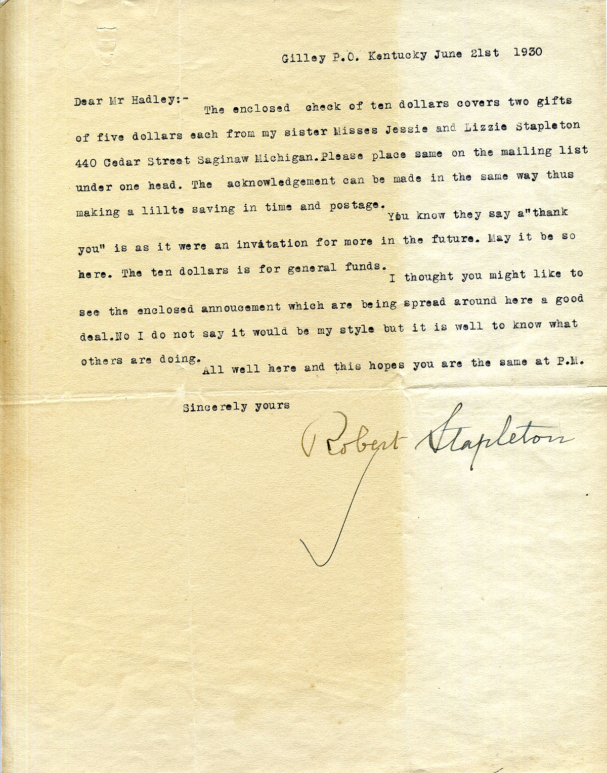 [stapleton_ida_r_1925_081.jpg] June 21, 1930. To Mr. Hadley from Robert Stapleton. Encloses check for $10 to cover gifts from his sisters Jessie and Lizzie Stapleton in Saginaw, Michigan. Encloses an “announcement which [is] being spread around here a good deal. No, I do not say it would be my style but it is well to know what others are doing.”