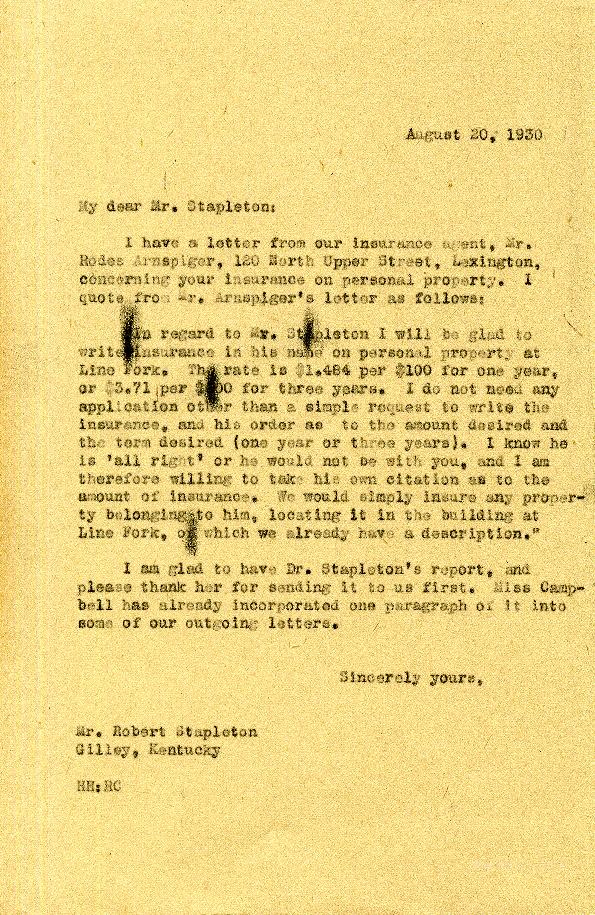 [stapleton_ida_r_1925_086.jpg] August 20, 1930. To Mr. Stapleton from HH. Sends a quote from the agent, Mr. Rodes Arnspiger in Lexington, concerning insurance on personal property at Line Fork.