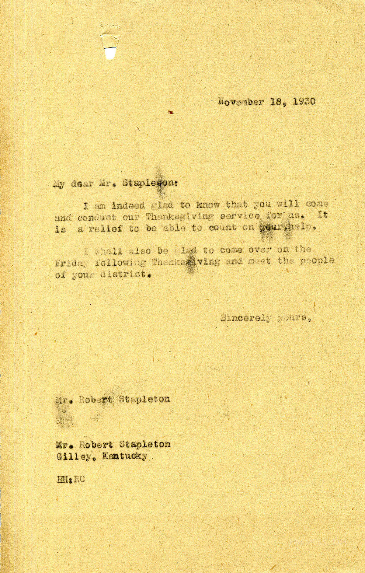 [stapleton_ida_r_1925_091.jpg] November 18, 1930. To Mr. Stapleton from HH. Glad Stapleton will contact the Thanksgiving service; HH will join the community dinner.