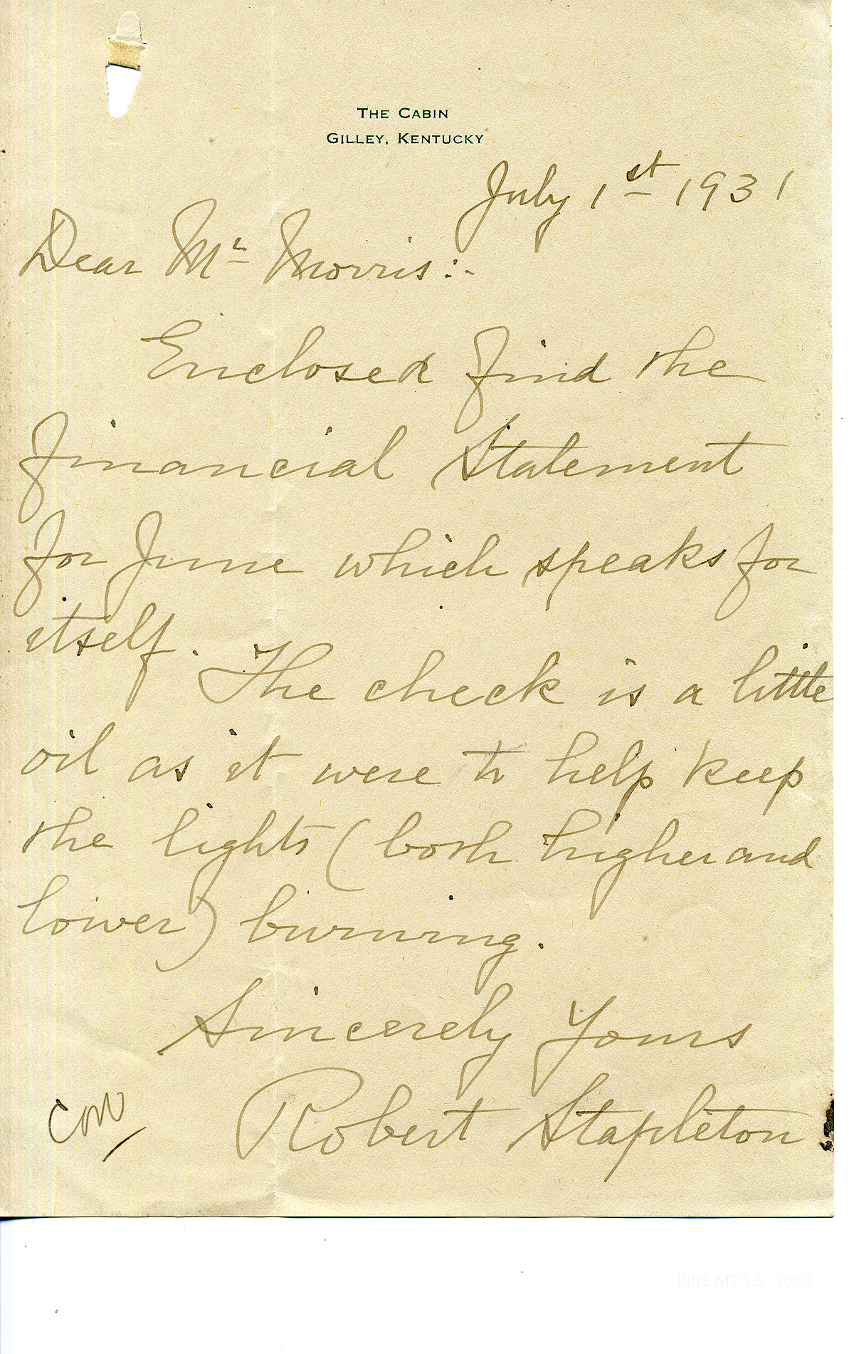 [stapleton_ida_r_1925_093.jpg] July 1, 1931. Handwritten note to Mr. [Glyn] Morris from Robert Stapleton. Encloses financial statement for June.