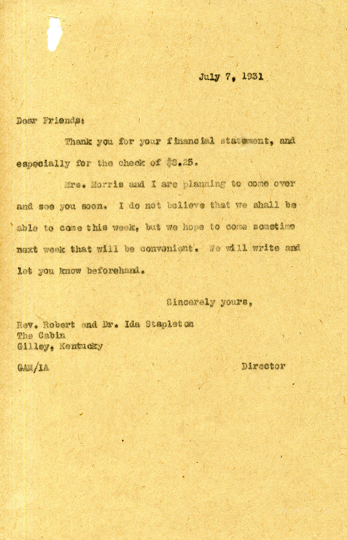 [stapleton_ida_r_1925_094.jpg] July 7, 1931. To Rev. Robert and Dr. Ida Stapleton from GAM. Thanks Stapletons for their financial statement and the check for $8.25. The Morrises are planning to visit Line Fork soon.