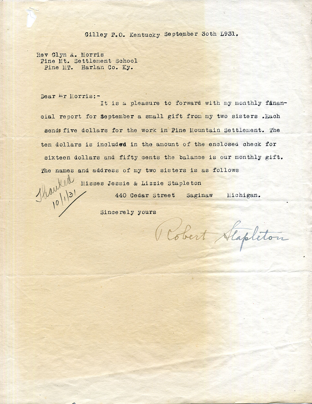 [stapleton_ida_r_1925_096.jpg] September 30, 1931. To Mr. Morris from Robert Stapleton. Along with his September financial report, he encloses a $5.00 gift from his two sisters, Jessie and Lizzie Stapleton in Saginaw, MI, and $10.00 as his monthly gift.