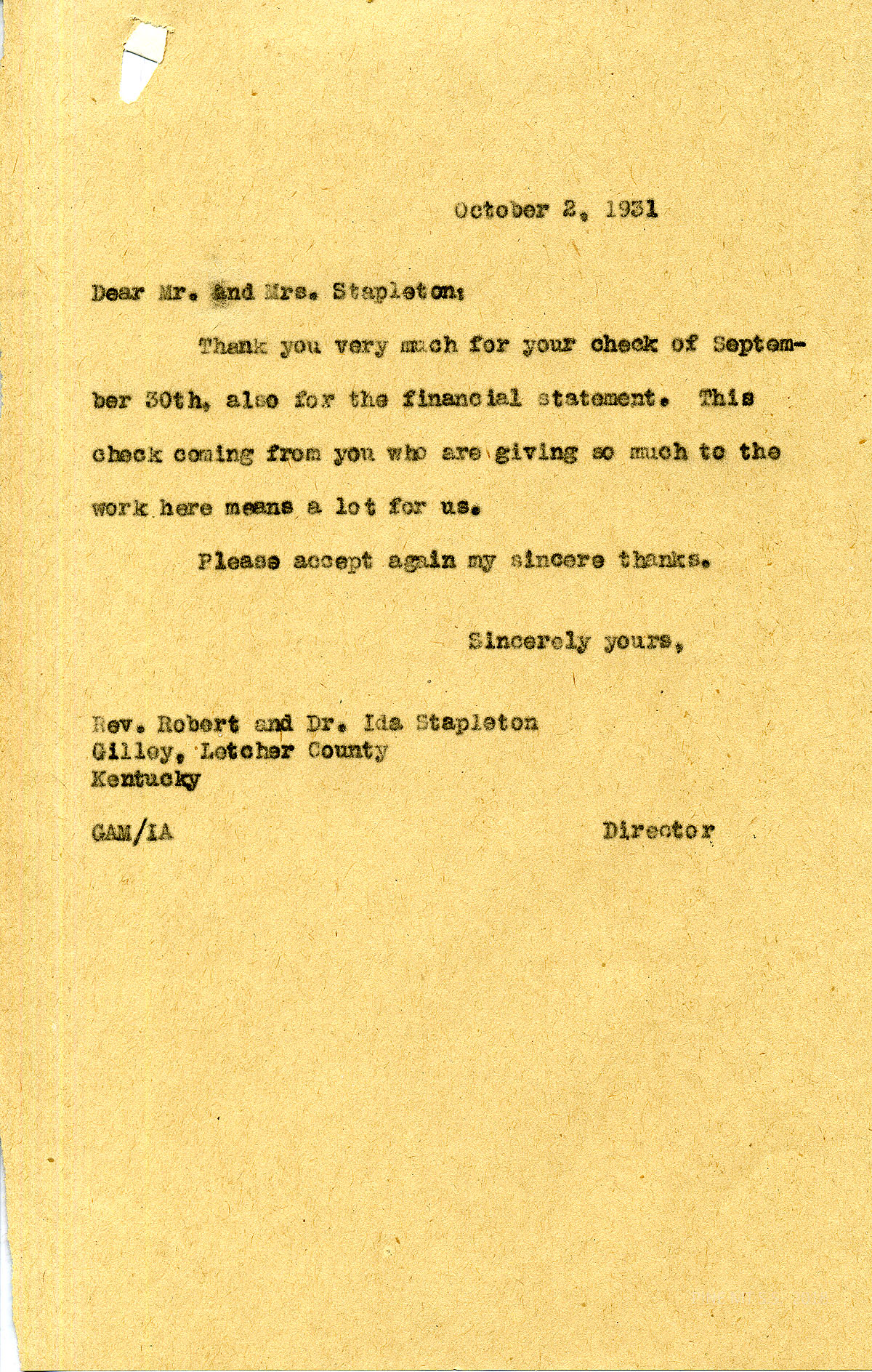 [stapleton_ida_r_1925_097.jpg] October 2, 1931. To Mr. and Mrs. Stapleton from GAM. Thanks them for their check and financial statement.
