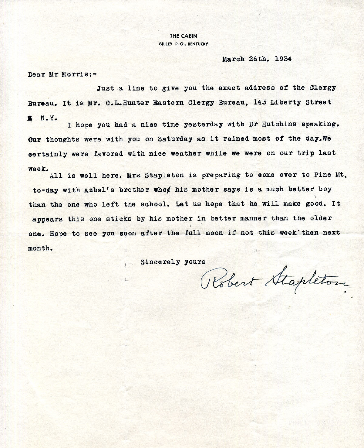 [stapleton_ida_r_1925_102.jpg] March 26, 1934. On letterhead stationery for “The Cabin, Gilley P.O., Kentucky” to Morris from Robert Stapleton. Provides address for the Eastern Clergy Bureau in NYC. ; Mentions Dr. [Francis S.] Hutchins speaking. Mrs. Stapleton will visit PMSS with Azbel’s brother.