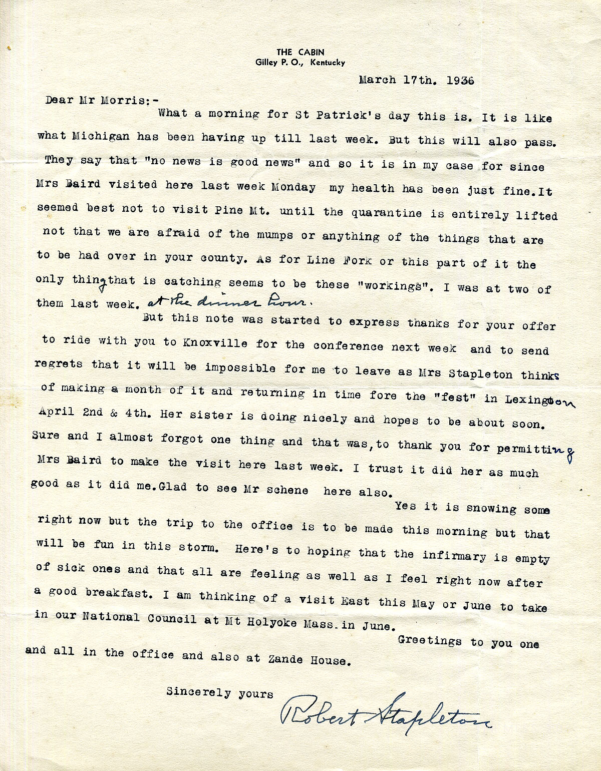 [stapleton_ida_r_1925_104.jpg] March 17, 1936. To Morris from Robert Stapleton on letterhead stationery for “The Cabin.” Mentions the snowy weather, Mrs. [Lexine] Baird’s visit to Line Fork, and attending “workings.” “It seemed best not to visit Pine Mt. until the quarantine is entirely lifted, not that we are afraid of the mumps or [any] of the things that are to be had over in your country.” Stapleton declines Morris’s offer to ride to the Knoxville conference with him, since Mrs. Stapleton is still with her sister. Stapleton may go to the National Council in Mt. Holyoke, Mass. in June.