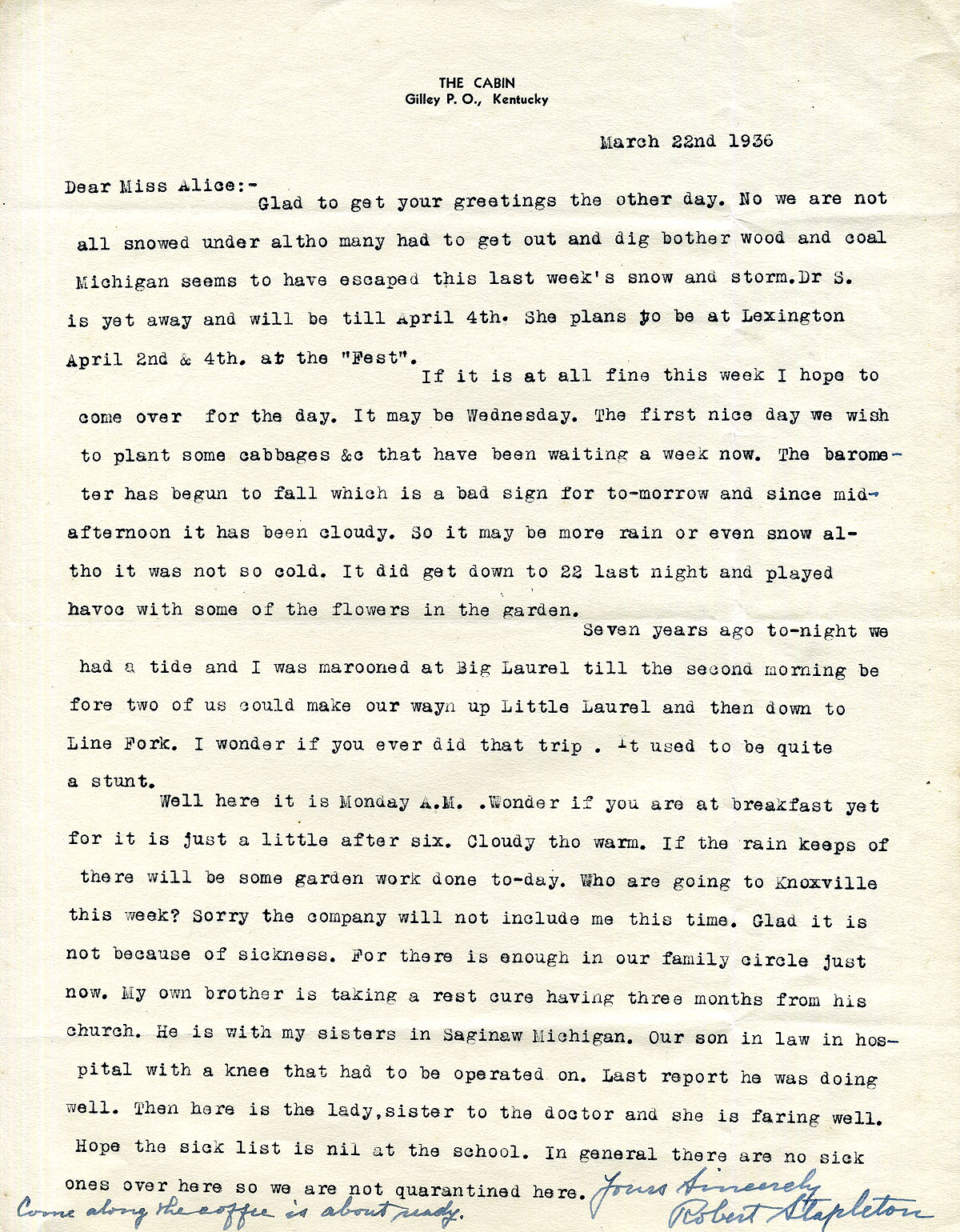 [stapleton_ida_r_1925_105.jpg] March 22, 1936. To “Miss Alice [Cobb]” from Robert Stapleton on letterhead stationery for “The Cabin.” Stapleton hopes to visit PMSS soon for a day. “Seven years ago tonight we had a tide and I was marooned at Big Laurel til the second morning before two of us could make our way up Little Laurel and then down to Line Fork. I wonder if you ever did that trip. It used to be quite a stunt.”