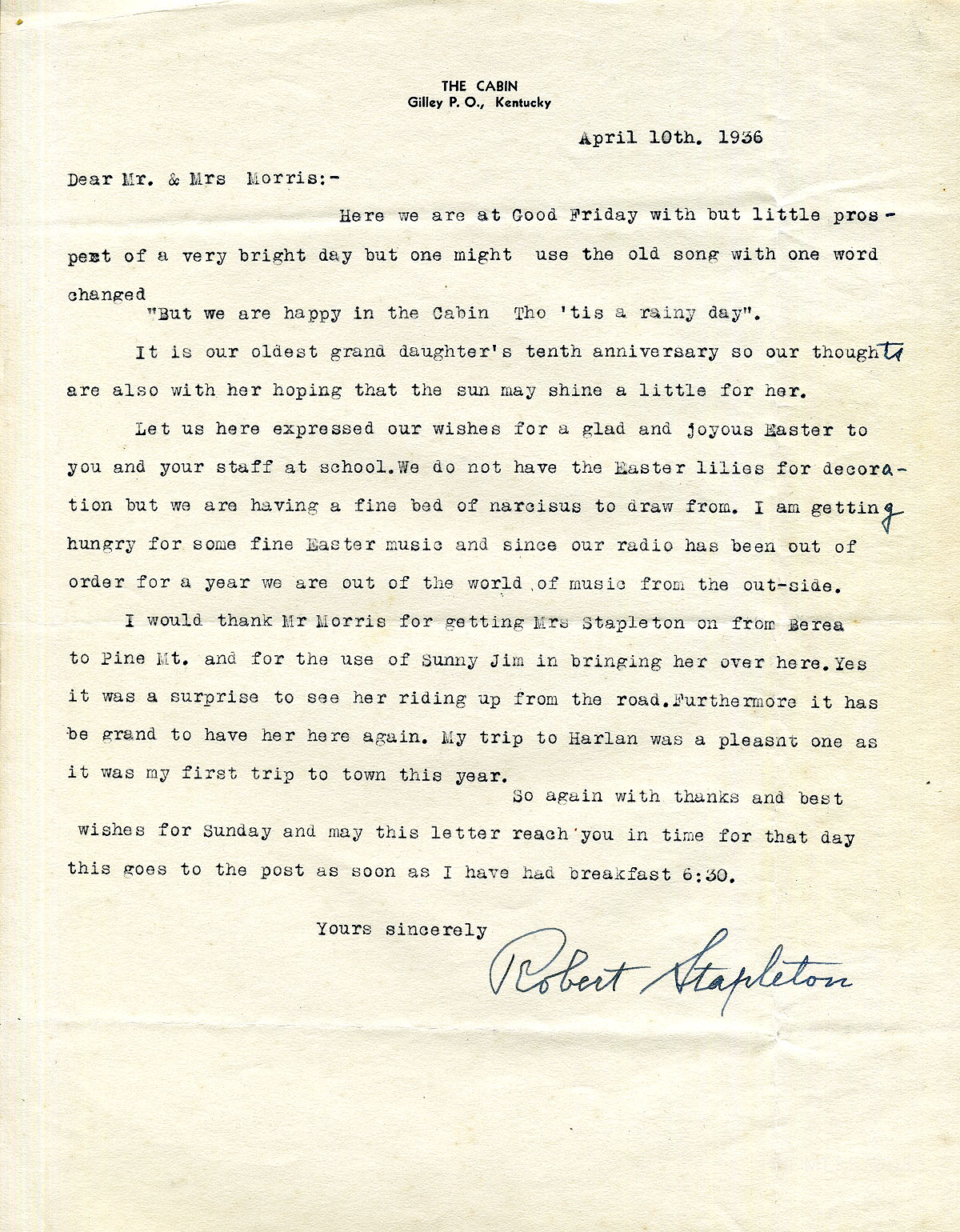 [stapleton_ida_r_1925_106.jpg] April 10, 1936. To Mr. and Mrs. Morris from Robert Stapleton on letterhead stationery for “The Cabin.” Thanks Mr. Morris for bringing Mrs. Stapleton to Pine Mountain from Berea.