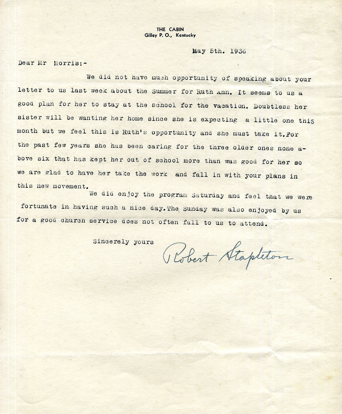 [stapleton_ida_r_1925_109.jpg] May 5, 1936. To Mr. Morris from Robert Stapleton on letterhead stationery for “The Cabin.” Suggests that it would be best for Ruth Ann to stay at PMSS for vacation and “fall in with your plans in this new movement” instead of helping with her sister’s children at home.