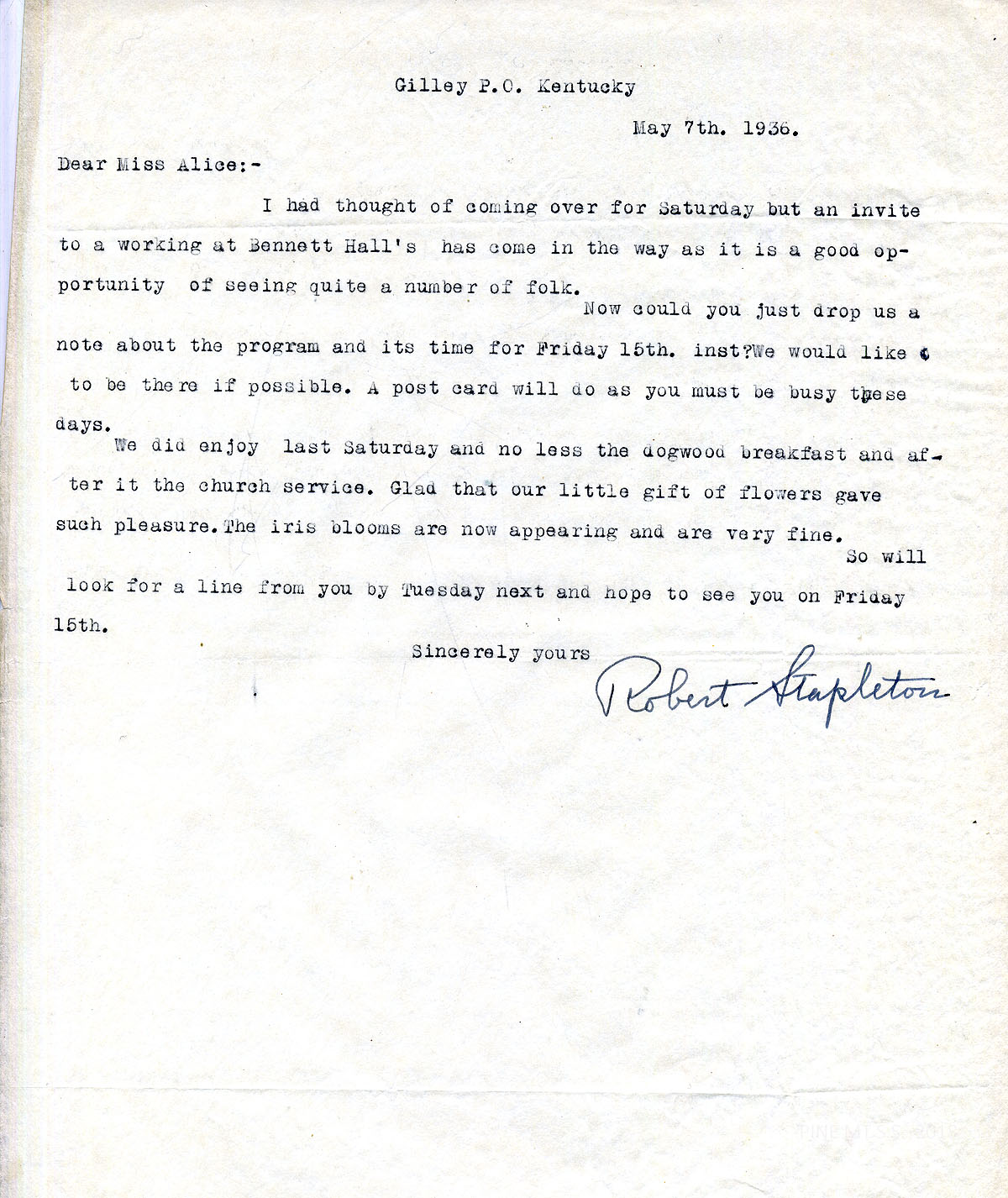 [stapleton_ida_r_1925_110.jpg] May 7, 1936. To “Miss Alice [Cobb]” from Robert Stapleton. Stapleton was invited to a “working” at Bennett Hall’s – “[A] good opportunity of seeing quite a number of folk.” Asked for information about the program on May 15; enjoyed the dogwood breakfast and church service last Saturday.