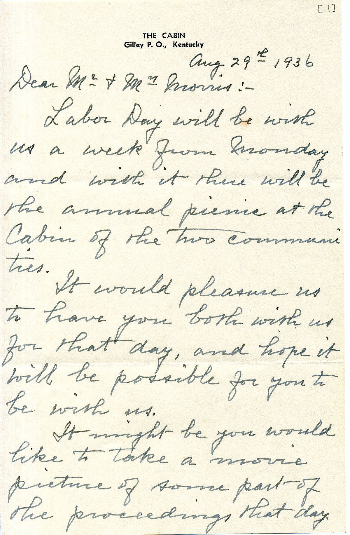 [stapleton_ida_r_1925_114.jpg] August 29, 1936. Two-page handwritten letter to Mr. and Mrs. Morris from Robert Stapleton on “The Cabin” stationery. Stapleton invites them to the annual Labor Day picnic at the Cabin for the two communities; suggests that they bring their movie camera. [115] Page 2. Hopes Miss [Alice] Cobb will be at the picnic.