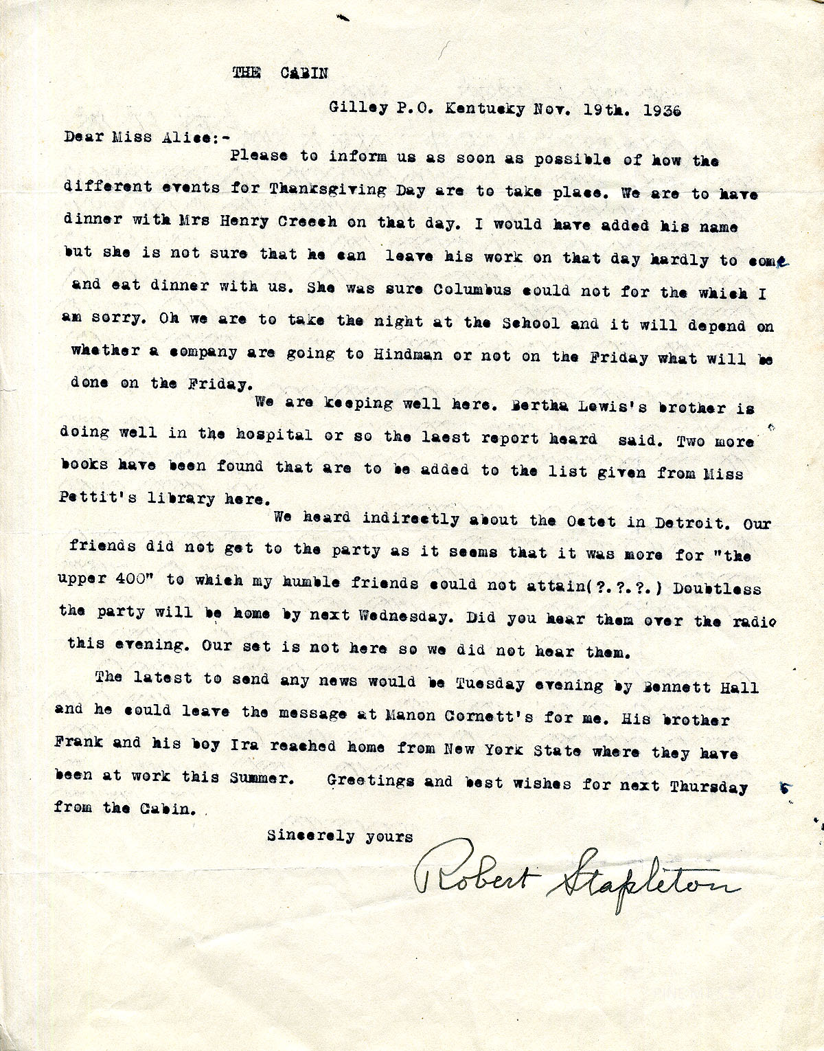 [stapleton_ida_r_1925_116.jpg] November 19, 1936. To “Miss Alice [Cobb]” from Robert Stapleton on “The Cabin” stationery. Asked Cobb about Thanksgiving Day events; will have dinner with Mrs. Henry Creech on Thanksgiving Day. He hears that Bertha Lewis’s brother is doing well in the hospital; two more books were found and “added to the list given from Miss Pettit’s library here.” Heard about the Octet in Detroit. “Our friends did not get to the party as it seems that it was more for ‘the upper 400’…” The Octet was also on the radio. Mentions Bennet Hall and Manon Cornett.
