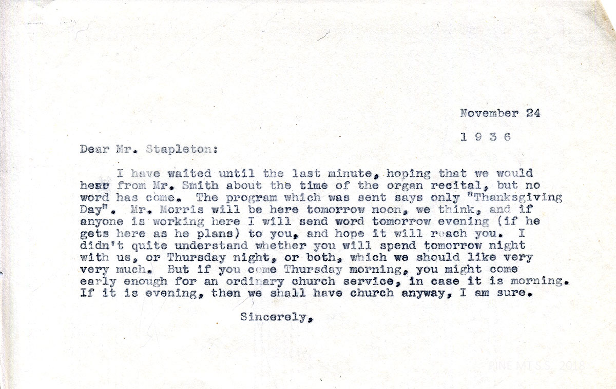 [stapleton_ida_r_1925_117.jpg] November 24, 1936. To Mr. Stapleton from [?]. Waiting for Mr. Smith to arrive in time for the organ recital. Mr. Morris returns tomorrow.