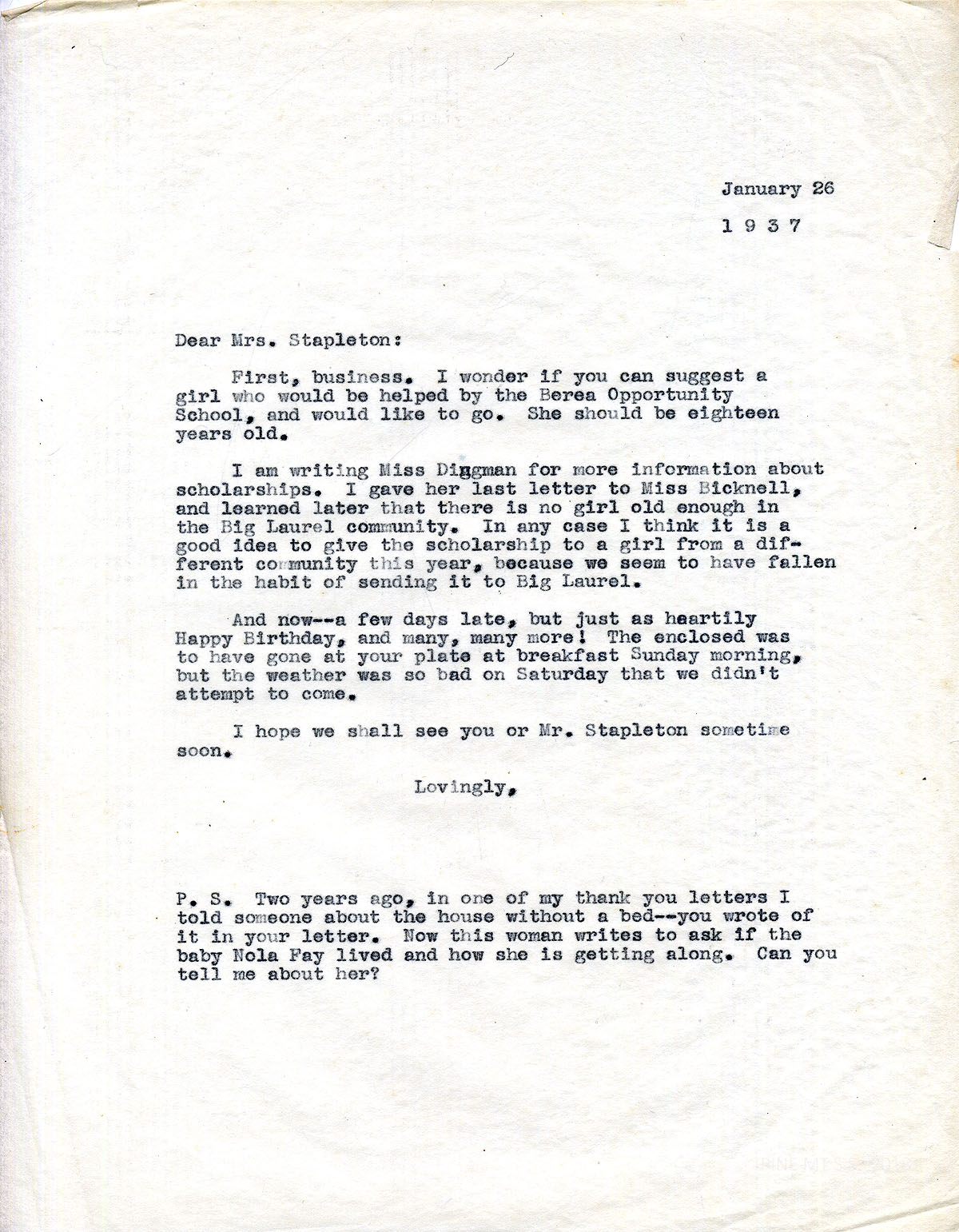 [stapleton_ida_r_1925_120.jpg] January 26, 1937. To Mrs. Stapleton from [Alice Cobb]. Asked Stapleton to suggest a girl for a scholarship to the Berea Opportunity School; will write Miss Dingman for more information. Asked for an update on Stapleton’s story about baby Nola Fay.