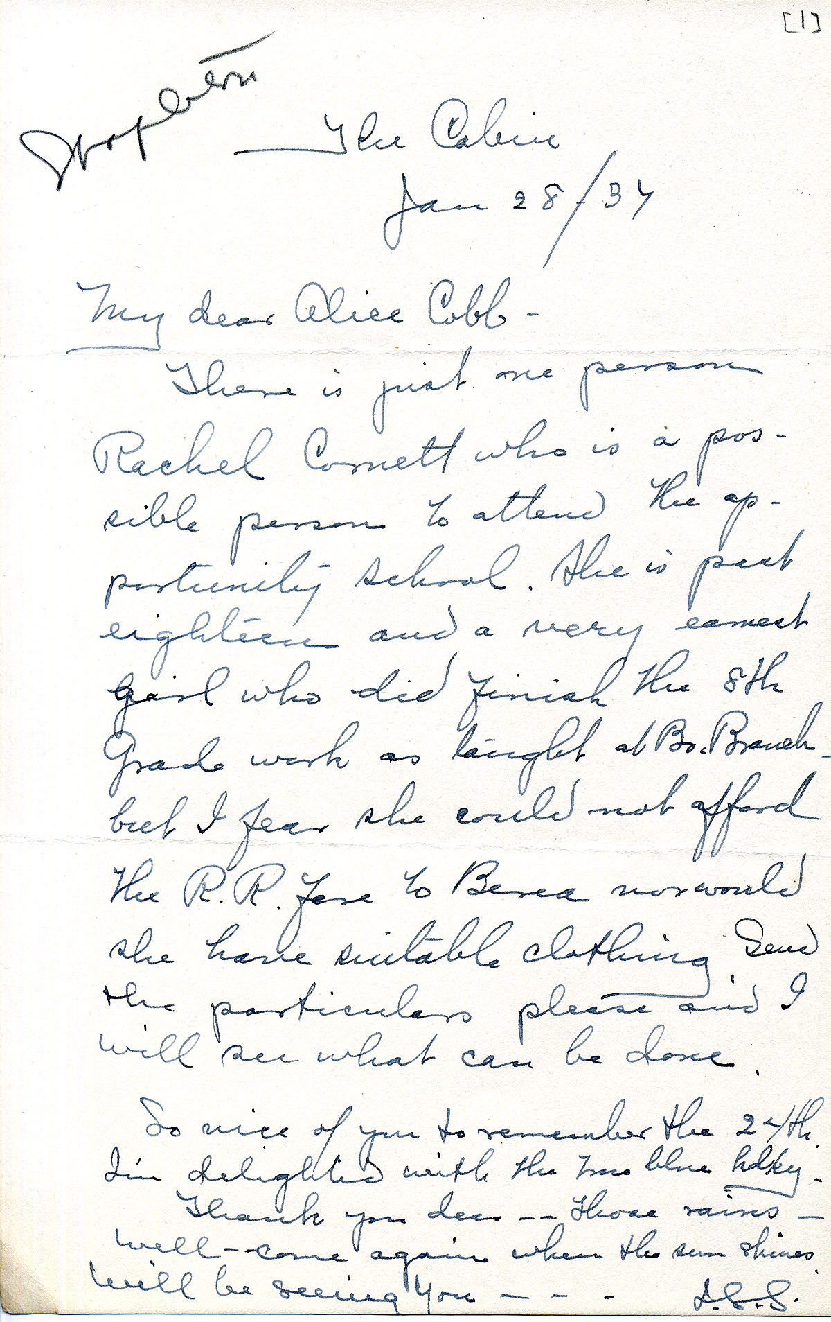 [stapleton_ida_r_1925_121.jpg] January 28, 1937. Two-page handwritten letter to Alice Cobb from Mrs. Stapleton. Recommends Rachel Cornett for the Berea Opportunity School and gives her credentials, but may not afford the railroad fare to Berea or have suitable clothing. [121a] Provides updates and story about Baby Nola Fay Holcomb and her family.