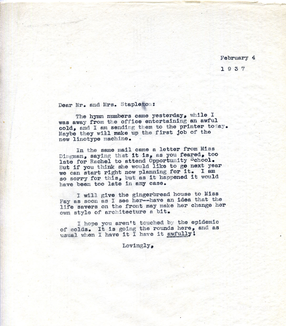 [stapleton_ida_r_1925_122.jpg] February 4, 1937. To Mr. and Mrs. Stapleton from [? likely Alice Cobb]. Received the hymn numbers and sending them to the printer. “Maybe they will make up the first job of the new linotype machine.” Also received a letter from Miss Dingman stating that it is too late for Rachel to attend Opportunity School; may try next year. Mentions Miss Fay; epidemic of colds.