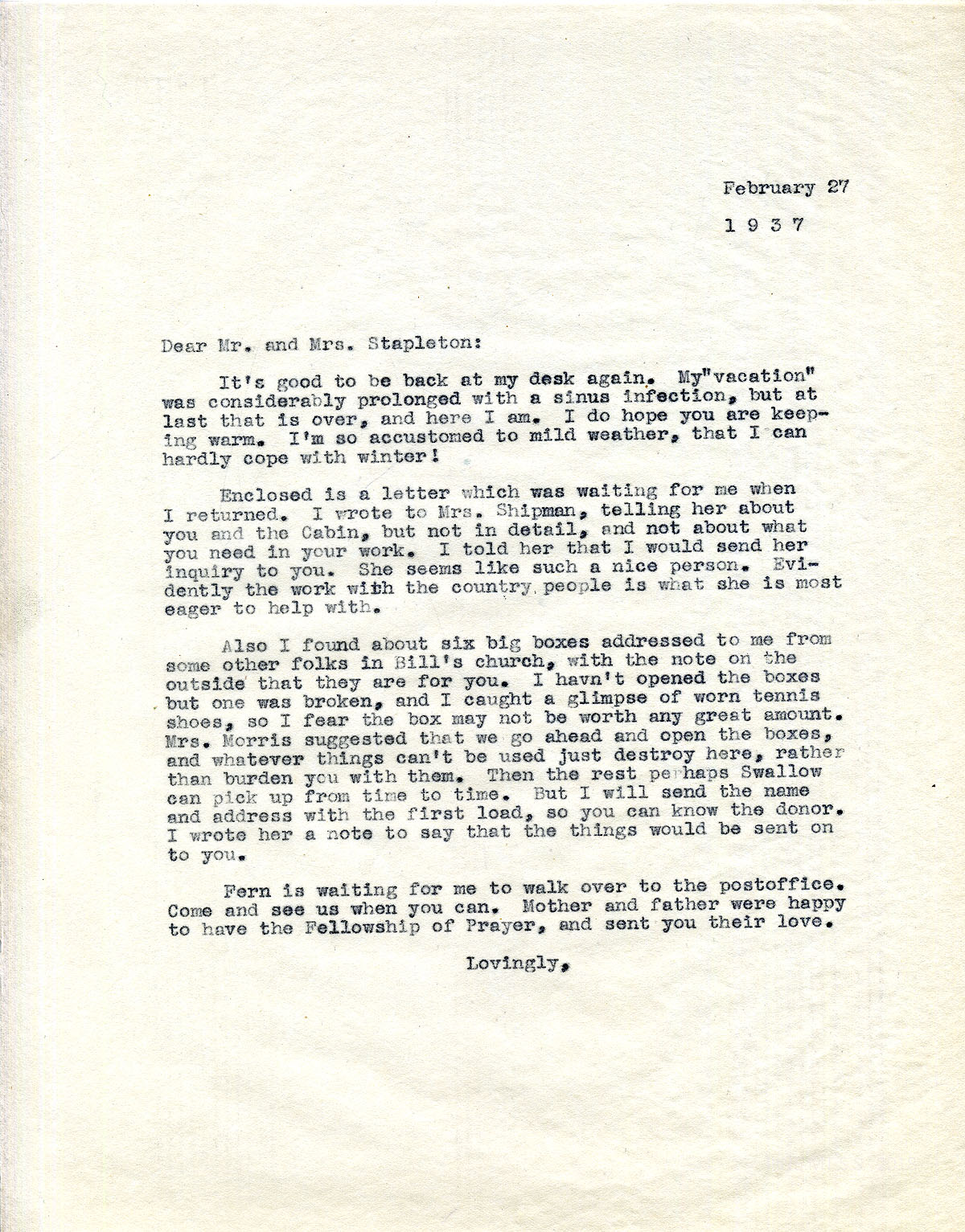 [stapleton_ida_r_1925_123.jpg] February 37, 1937. To Mr. and Mrs. Stapleton from [? likely Alice Cobb]. Encloses letter from Mrs. Shipman, asking about work with the country people. Received six boxes, possibly of donated clothes, addressed to Stapleton. Mentions Fern Hall