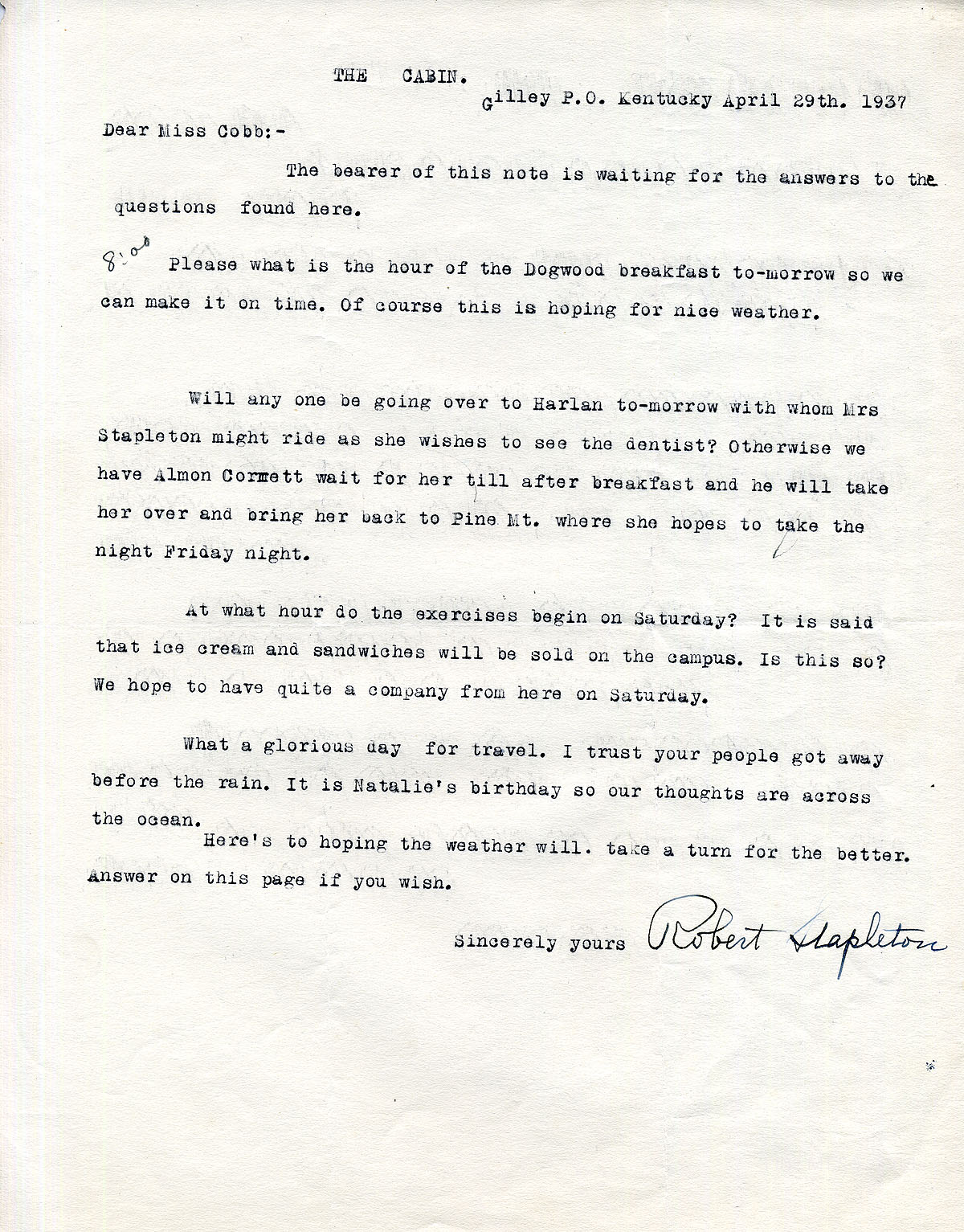 [stapleton_ida_r_1925_125.jpg] April 29, 1937. To Miss Cobb from Robert Stapleton. Asks the time of the dogwood breakfast (8:00). Mrs. Stapleton needs a ride to a Harlan dentist – may ask Almon Cornett. Asked what time the Saturday “exercises” begin and if there will be ice cream and sandwiches.