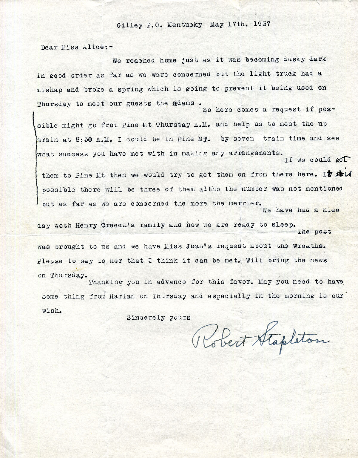 [stapleton_ida_r_1925_126.jpg] May 17, 1937. To “Miss Alice [Cobb]” from Robert Stapleton. Asked for help in meeting the train bringing the Adams.