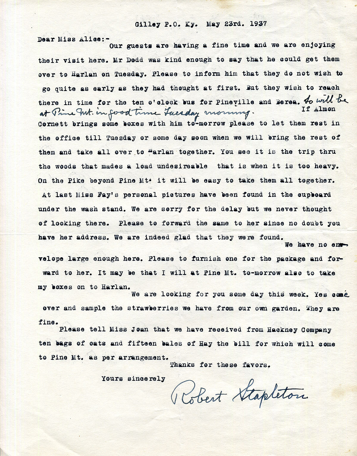 [stapleton_ida_r_1925_127.jpg] May 23, 1937. To “Miss Alice [Cobb]” from Robert Stapleton. Enjoyed their guests. [Arthur] Dodd offered to take them to Harlan on Tuesday but they wish to leave later via bus. Makes arrangements for his boxes to Harlan. Miss Fay’s personal photographs have been found and asks Cobb to mail them to her. Sends message to Miss Jean concerning oats and hay from Hackney Company.