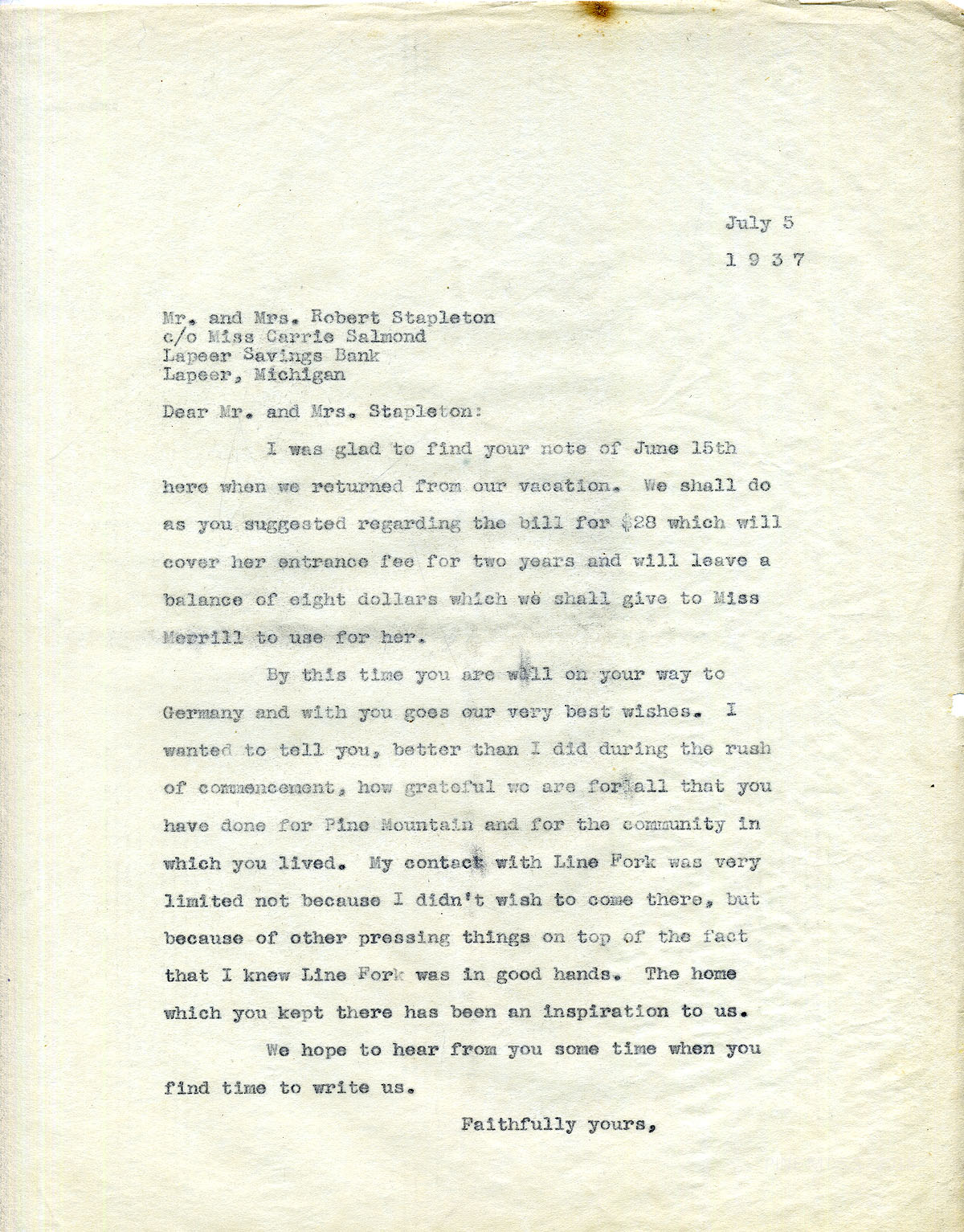 [stapleton_ida_r_1925_128.jpg] July 5, 1937. To Mr. and Mrs. Stapleton in Lapeer, MI (c/o Miss Carrie Salmond, Lapeer Savings Bank) from [?]. “We shall do as you suggested regarding the bill for $28 which will cover her entrance fee for two years and will leave a balance of eight dollars which we shall give to Miss [Louise] Merrill to use for her. By this time you are well on your way to Germany and with you goes our very best wishes. I wanted to tell you, better than I did during the rush of commencement, how grateful we are for all that you have done for Pine Mountain and for the community in which you lived. … The home which you kept there has been an inspiration to us. …”