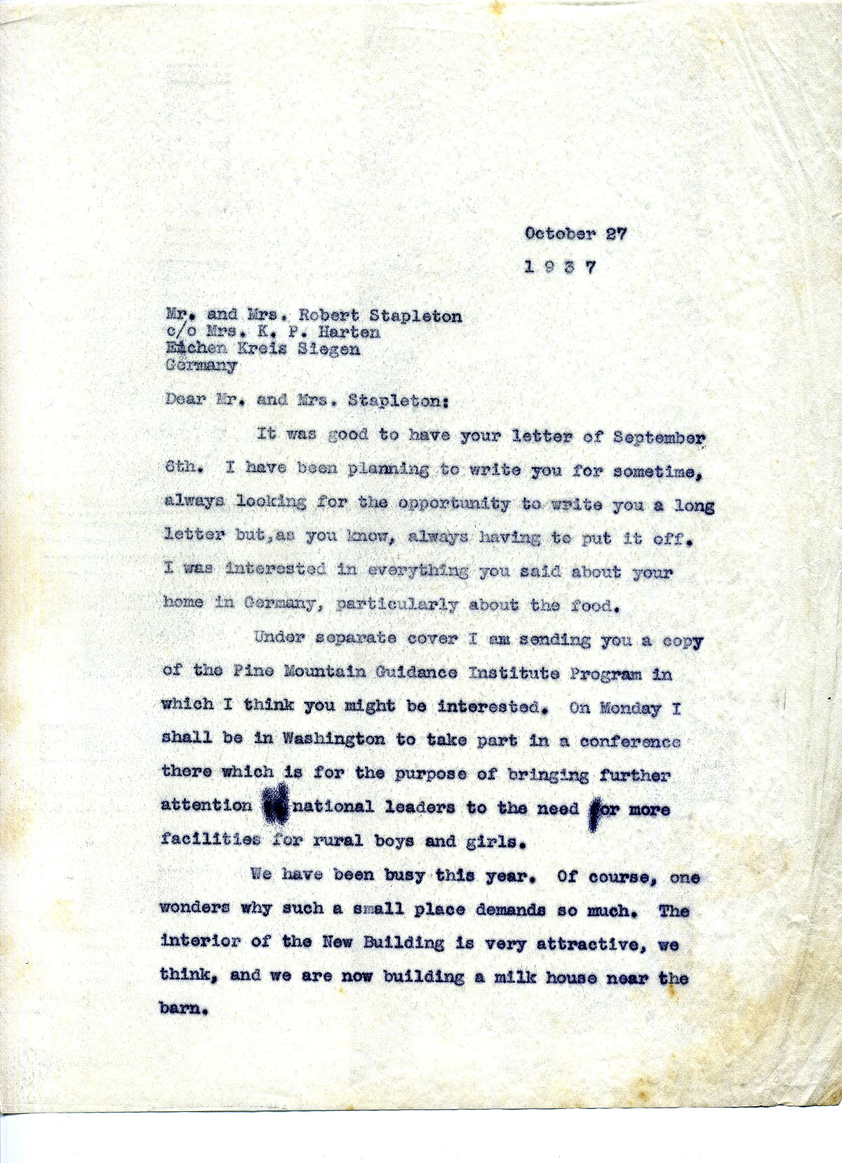 [stapleton_ida_r_1925_130.jpg] October 27, 1937. Two-page letter to Mr. and Mrs. Stapleton in Germany from [? likely, Glyn Morris.] Encloses a copy of the Pine Mountain Guidance Institute Program; plans to attend a conference in Washington to bring attention of national leaders to the need for more facilities for rural children. PMSS has a New Building and is now building a milk house near the barn. [130a] Page 2. The staff this year is a variety of all ages and more mature than last year. “The Bakers [Robert and Lutrella Baker] seem to like Line Fork….I miss very much your visits here at Pine Mountain and the good chats we used to have in the Office. …”