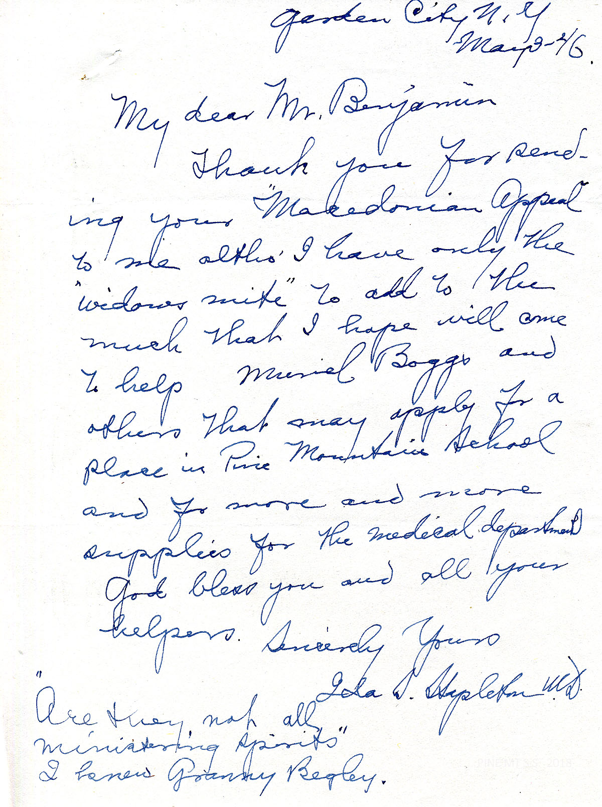[stapleton_ida_r_1925_131.jpg] May 3 [?], 1946. Handwritten letter to Mr. [H.R.S.] Benjamin from Ida S. Stapleton in Garden City, NY. Thanks him for his “Macedonian Appeal”; mentions Muriel Boggs and Granny Begley.