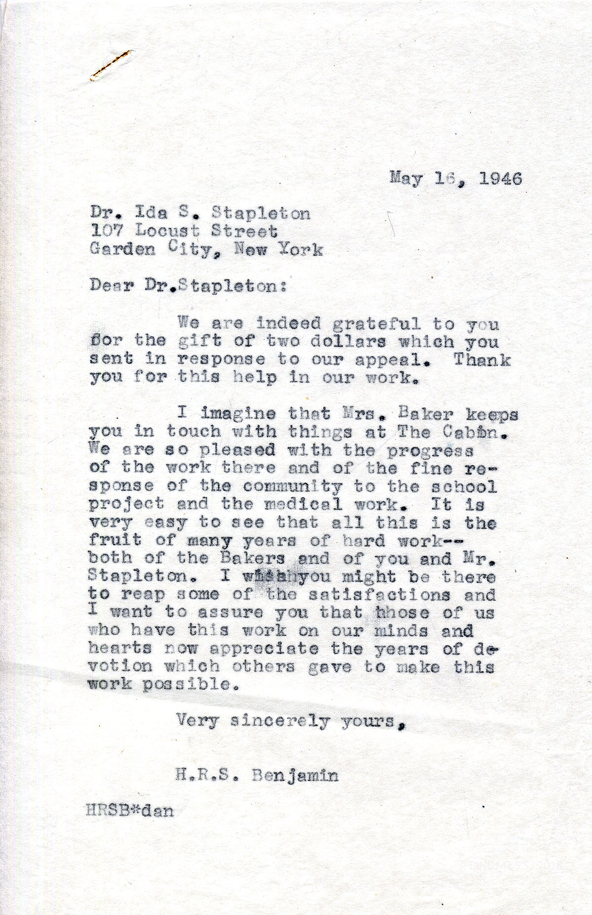 [stapleton_ida_r_1925_132.jpg] May 16, 1946. To Dr. Stapleton in Garden City, NY, from H.R.S. Benjamin. Thanks her for the gift of $2.00. Expresses appreciation for the work that Mrs. Baker and the Stapletons at Line Fork.