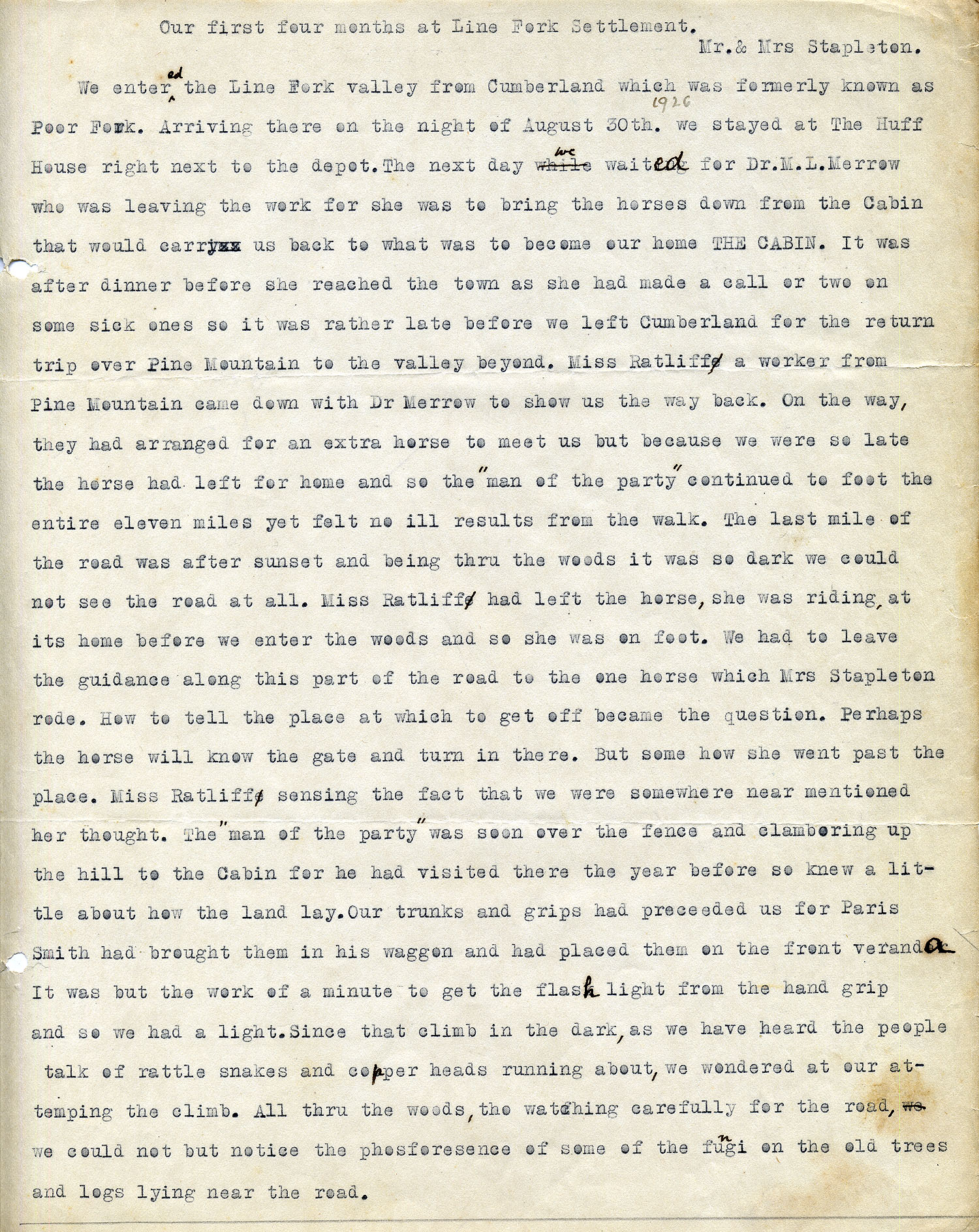 We entered the Line Fork valley from Cumberland which was formerly known as Poor Fork. Arriving there on the night of August 30th [1926] we stayed at the Huff House right next to the depot. The next day we waited for Dr. M. L. Merrow who was leaving the work for she was to bring the horses down from the Cabin that would carry us back to what was to become our home THE CABIN. It was after dinner before she reached the town as she had made a call or two on some sick ones so it was rather late before we left Cumberland for the return trip over Pine Mountain to the valley beyond. Miss Ratliff a worker from Pine Mountain came down with Dr Merrow to show us the way back. On the way, they had arranged for an extra horse to meet us but because we were so late the horse had left for home and so the “man of the party” continued to foot the entire eleven miles yet felt no ill result from the walk. The last mile of the road was after sunset and being through the woods it was so dark we could not see the road at all. Miss Ratliff had left the horse she was riding at its home before we entered the woods and so she was on foot. We had to leave the guidance along this part of the road to the one horse which Mrs Stapleton rode. How to tell the place at which to get off became the question. Perhaps the horse will know the gate and turn in there. But somehow she went past the place. Miss Ratliff sensing the fact that we were somewhere near mentioned her thought. The “man of the party” was soon over the fence and clambering up the hill to the Cabin for he had visited there the year before so knew a little about how the land lay. Our trunks and grips had proceeded us, for Paris Smith had brought them in his waggon [sic] and had placed them on the front veranda. It was but the work of a minute to get the flashlight from the hand grip and so we had a light. Since that climb in the dark, as we have heard the people talk of rattlesnakes and copperheads running about, we wondered at our attempting the climb. All thru the woods, the watching carefully for the road, we could not but notice the phosphorescence of some of the fungi on the old trees and logs lying near the road.