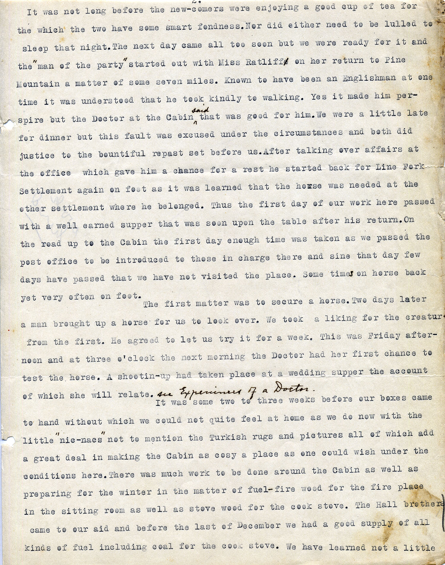The first matter was to secure a horse. Two days later a man brought up a horse for us to look over. We took a liking for the creature from the first. He agreed to let us try it for a week. This was Friday afternoon and at three o’clock the next morning the Doctor had her first chance to test the horse. A shootin-up had taken place at a wedding supper the account of which she will relate (see “Some Experiences in the life of the Doctor“).