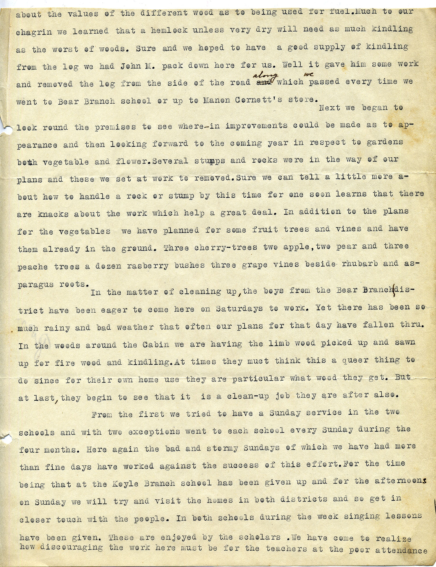 In the matter of cleaning up, the boys from the Bear Branch district have been eager to come here on Saturdays to work. Yet here has been so much rainy and bad weather that often our plans for that day have fallen thru. In the woods around the Cabin we are having the limb wood picked up and sawn up for firewood and kindling. At times they must think this a queer thing to do since for their own home use they are particular what wood they get. But at last, they begin to see that it is a clean-up job they are after also.
