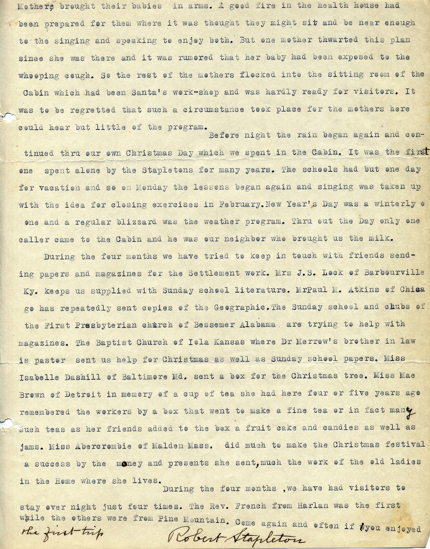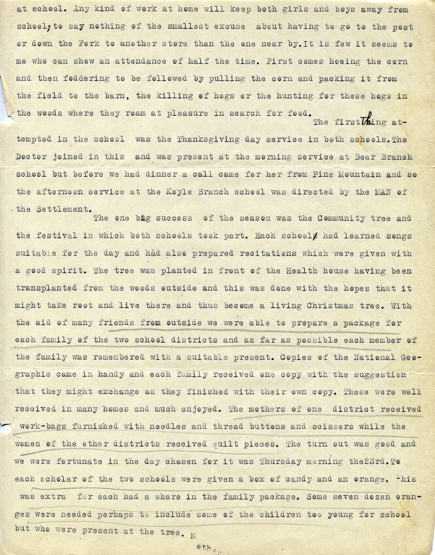 Dr. Ida Stapleton ; Rev. Robert Stapleton ; Pine Mountain Settlement School ; Line Fork Settlement ; Line Fork Valley ; Cumberland ; Poor Fork ; Huff House ; Dr. M. L. Merrow ; horses ; Cabin ; Miss Ratliff ; Paris Smith ; rattlesnakes ; copperheads ; fungi phosphorescence ; doctors ; shootin-up ; Turkish rugs ; Hall brothers ; hemlock ; Bear Branch school ; Manon Cornett’s store ; gardens ; vegetables ; fruit ; foddering ; Bear Branch district ; kindling ; firewood ; Sunday services ; Koyle Branch school ; singing lessons ; school attendance ; hogs ; whooping cough ; Thanksgiving Day services ; Community Christmas tree ; festival ; Health house ; National Geographic ; work-bags ; quilt pieces ; oranges ; Christmas Day ; New Year’s Day ; Mrs J. S. Lock ; Sunday School literature ; Paul M. Atkins ; First Presbyterian church ; magazines ; Baptist Church ; Miss Mae Brown ; Miss Abercrombie ; Rev French ; Pine Mountain, KY ; Harlan County, KY ; Line Fork, KY ; Gilley, KY ; Letcher County, KY ; Barbourville, KY ; Chicago, IL ; Bessamer, AL ; Iola, KS ; Detroit, MI ; Malden, Ms ; Harlan, KY ;
