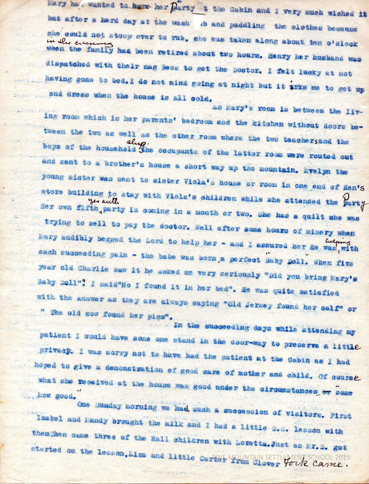 As Mary’s room is between the living room which is her parents’ bedroom and the kitchen without doors between the two as well as the other room where the two teachers and the boys of the household sleep, the occupants of the latter room were routed out and sent to a brother’s house a short way up the mountain. Evelyn [Ethel] the young sister was sent to sister Viola’s house or room in one end of Hen’s store building to stay with Viola’s children while she attended the Party. Her own fifth, yes sixth party is coming in a month or two. She has a quilt she was trying to sell to pay the doctor. Well after some hours of misery when Mary audibly begged the Lord to help her – and I assured her He was helping with each succeeding pain – the babe was born, a perfect “Baby Doll”. When five year old Charlie saw it he asked me very seriously “Did you bring Mary’s Baby Doll?” I said, “No I found it in her bed”. He was quite satisfied with the answer as they are always saying “Old Jersey found her calf” or “The old sow found her pigs”.